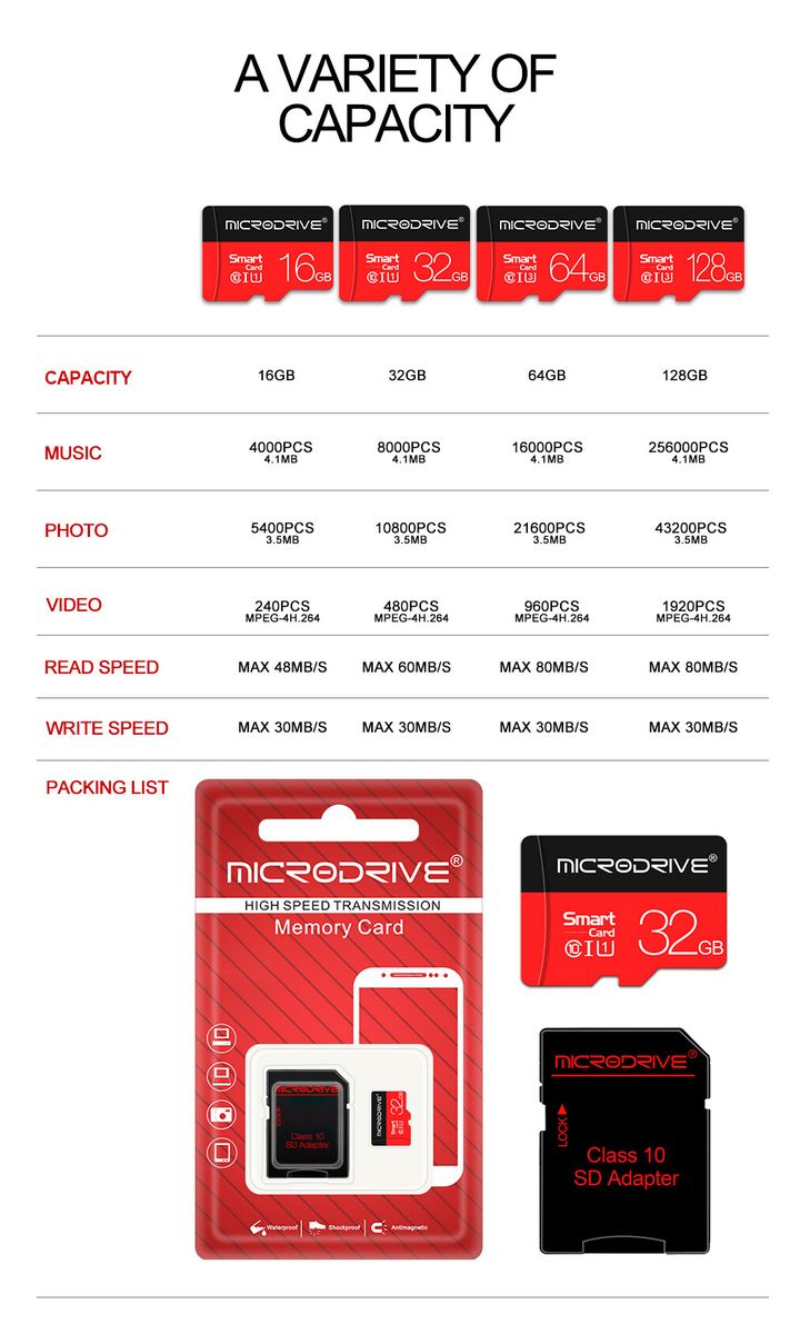 / / MP3 / MP4 / Speaker / Tablet PC Capacity8GB / 16GB / 32GB / 64GB / 128GBRead SpeedClass 10( 80Mb/s)FeaturePlug Play / Large CompatibilityTypeTF Card / SD CardColor TypeAs Pictures ShowPackage Included1* Memory Card