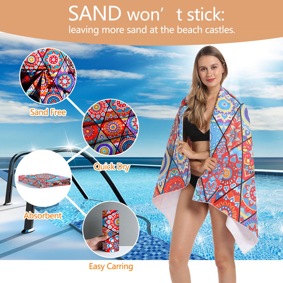 3. Microfiber Material: Our quick dry beach towel features high quality microfiber that absorbs water much faster than normal fabric, which is environmental without fade and odor. You can carry it easily and avoid being wet and cold on the beach.