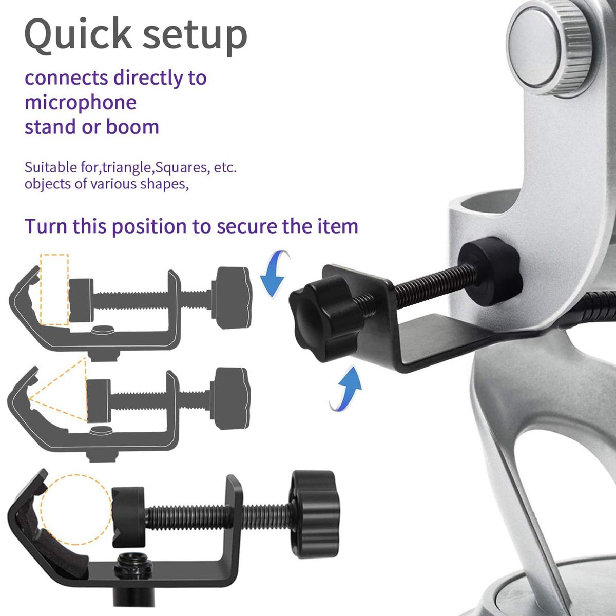 Adjustable screw rotating clamp with scratch-proof gripper can secure variety tubular mounting booms or microphone stands.
