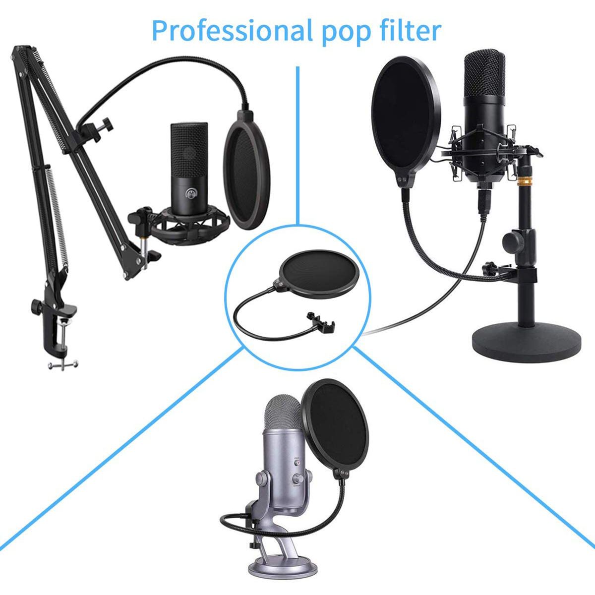 Microphone pop filter to instantly improve the sound of your vocal recordings, 360 degrees flexible arm holder, all-Round adjustment. It is suitable for broadcast studios, professional recording studios, podcast live broadcasts, etc.