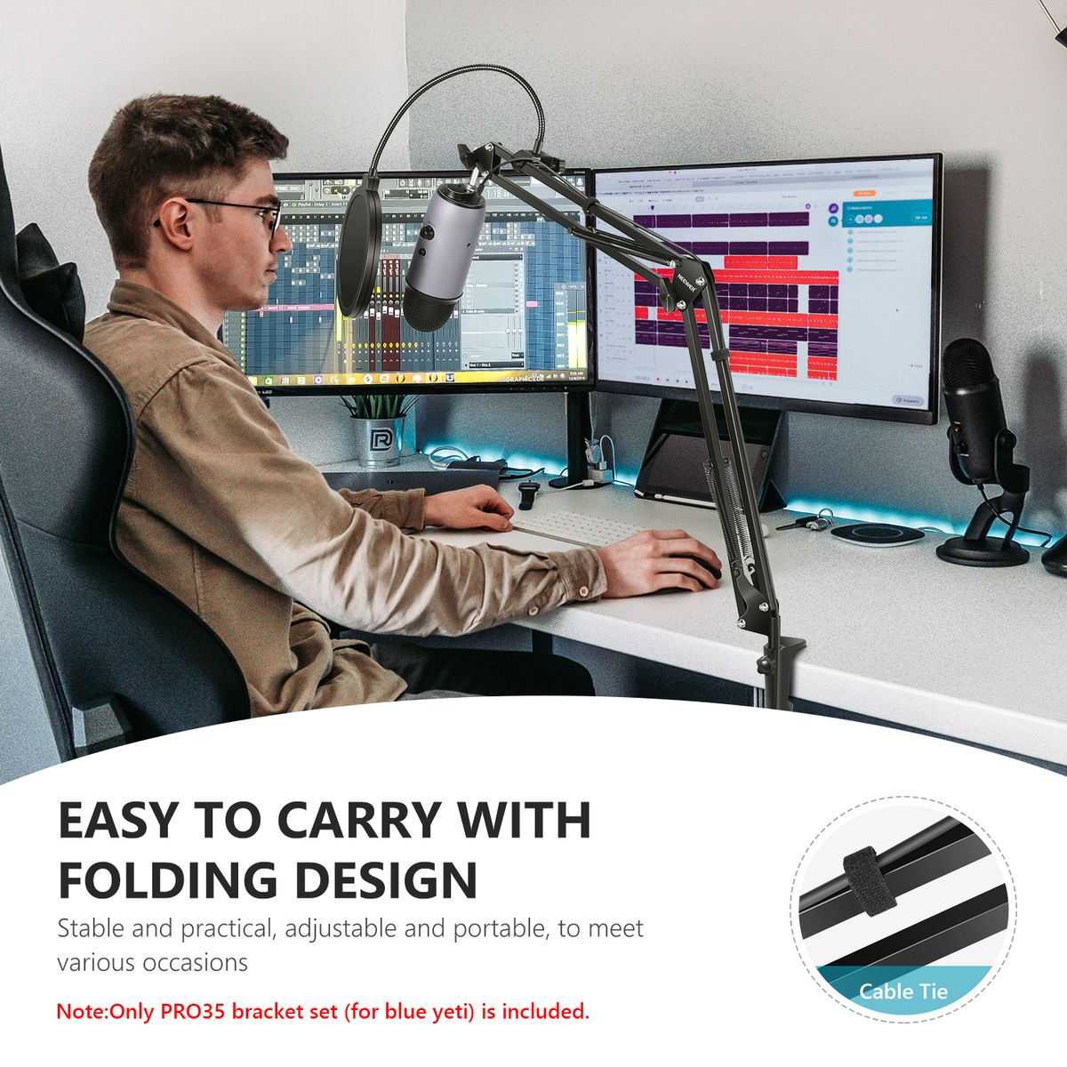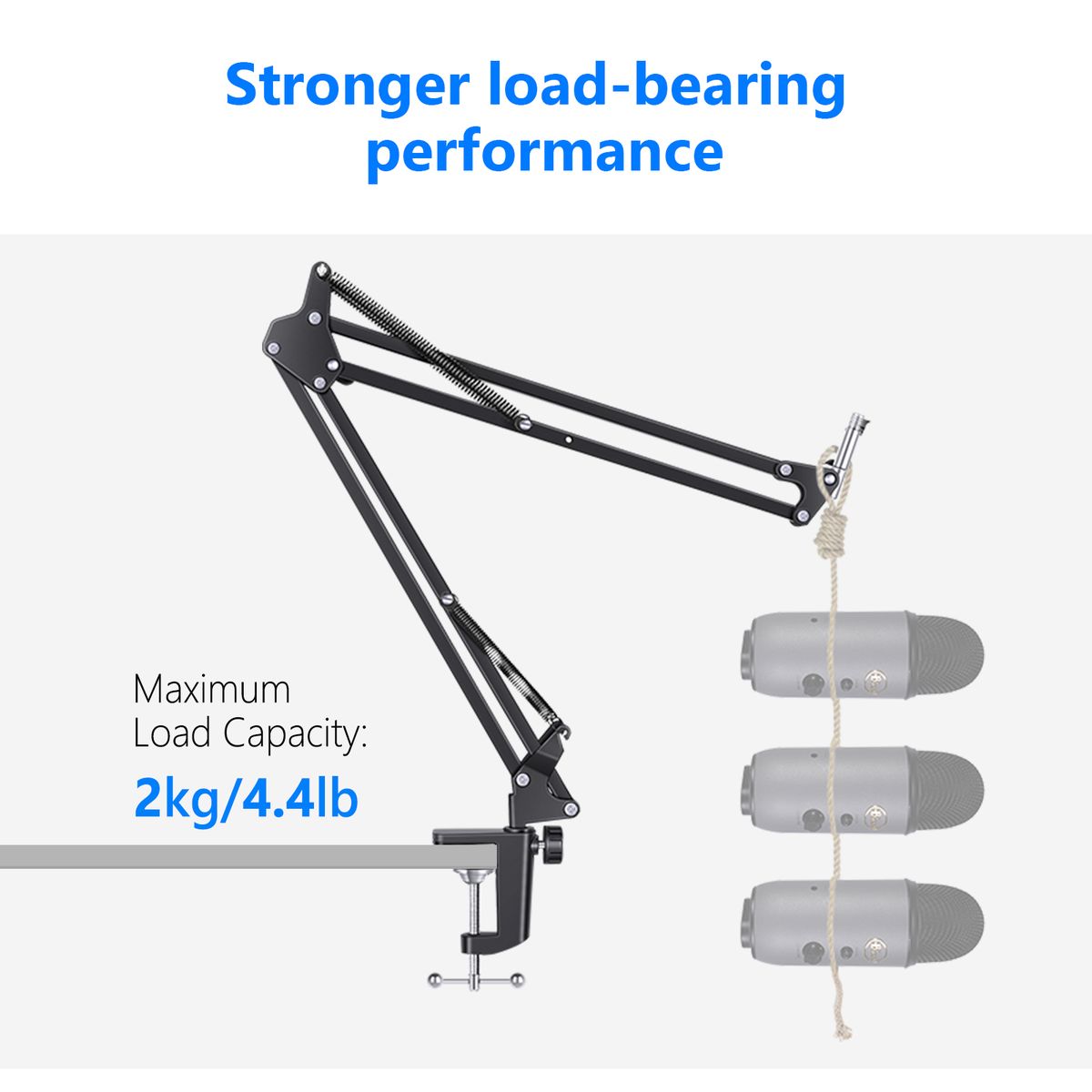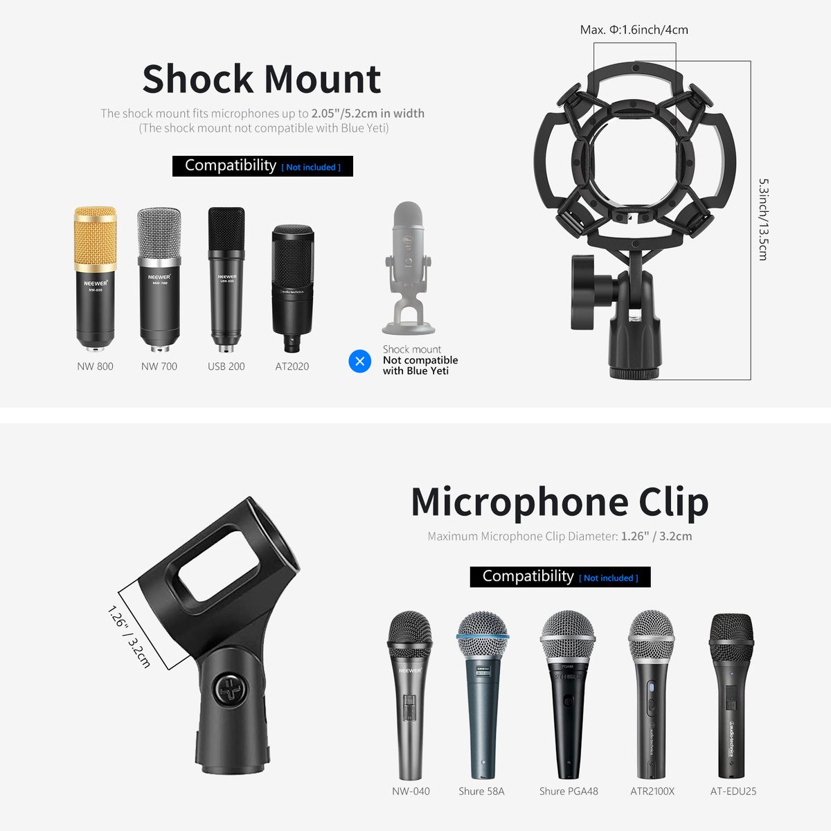 Please measure the thickness of your desktop (less than 5cm).Please confirm your microphone diameter before ordering: plastic microphone clip - diameter: 46-52 mm - shock absorber bracket maximum diameter: 5.2 cm Maximum load: 1 kg.explain:The NEEWER enhanced microphone bracket is made of metal, with double tension arms and powerful springs, which can be used under different conditions. The more durable quality can guarantee a longer service life.By improving the design, the needs of studios and other professional users can be met. The length of single shear arm is 35cm.The scissor arm is equipped with a flexible suspension bracket, which can be rotated in different directions to meet your needs.Microphone feet are easy to install, lift, reposition, and move from one position to another.Soft desk stand prevents scratches.Compatible with high-performance microphones (Blue Yeti Snowball Microphones, Blue Yeti Nano Microphones, etc.) and some other standard size and partially capacitive handheld microphones.It is very suitable for home, stage and studio, podcast, conference, video, conference, program, TV channel, etc.Technical features:Material (shock absorber and boom): iron.Material (microphone clip): plastic.Weight: 0.16 kg.Maximum. Maximum load: 1 kg.Length of each arm: 35cm.Microphone clamp diameter: 46-52mm.Maximum damper diameter: 5.2cmMaximum. Clamp thickness: 5cm.Content:1 foot NW-35 Pro microphone.1 micro pop filter.1 Shock absorber bracket.3 Cable clamp.1 Bench clamp bracket.One 3/8 "plug to 5/8" inner nut.1 Foam cover.1 ribbon.1 microphone clip.