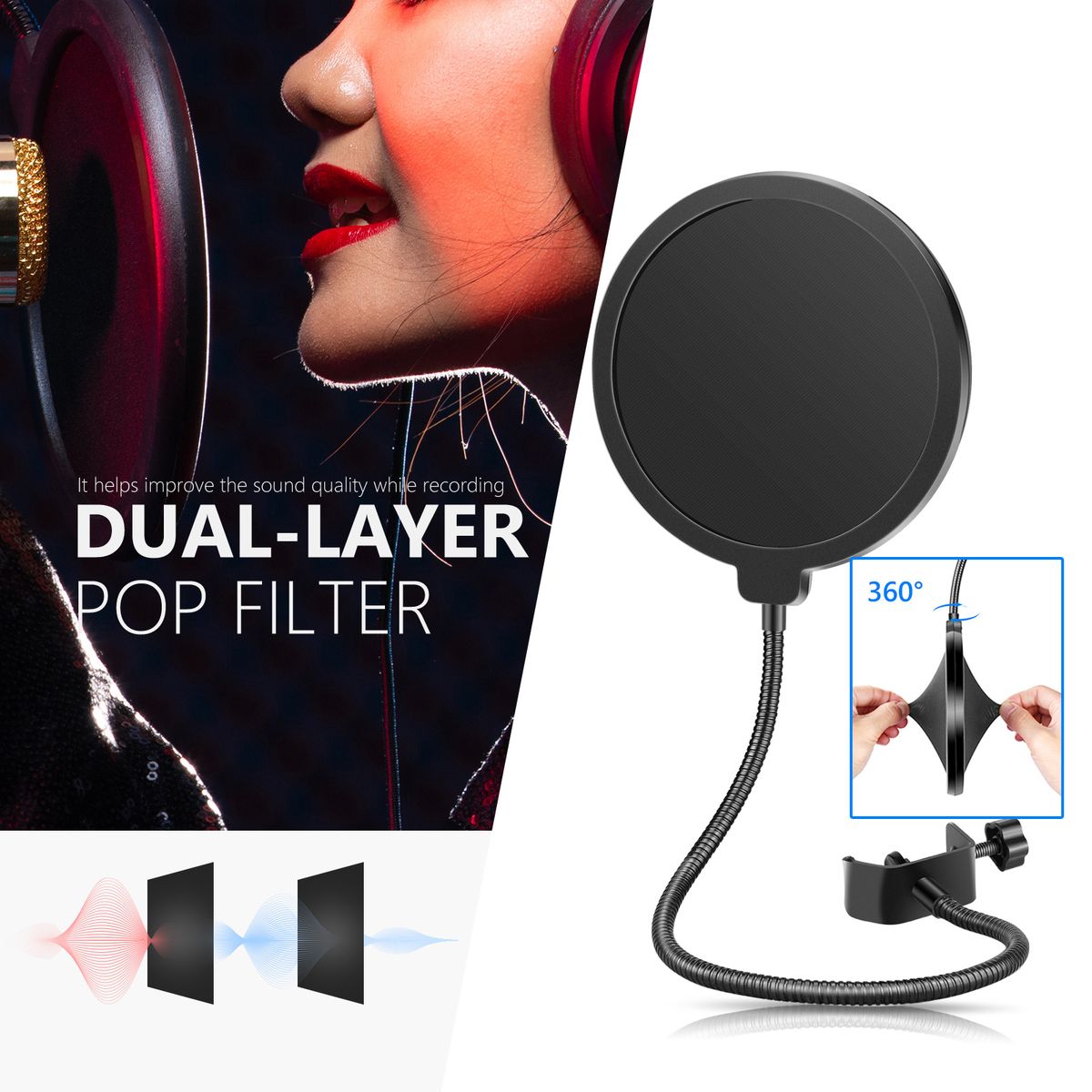 [Shock absorber bracket and Pop filter] The shock absorber bracket can be installed on a microphone with a diameter of 5.2 cm (2.05 inches) and minimize vibration noise to obtain clear sound output.