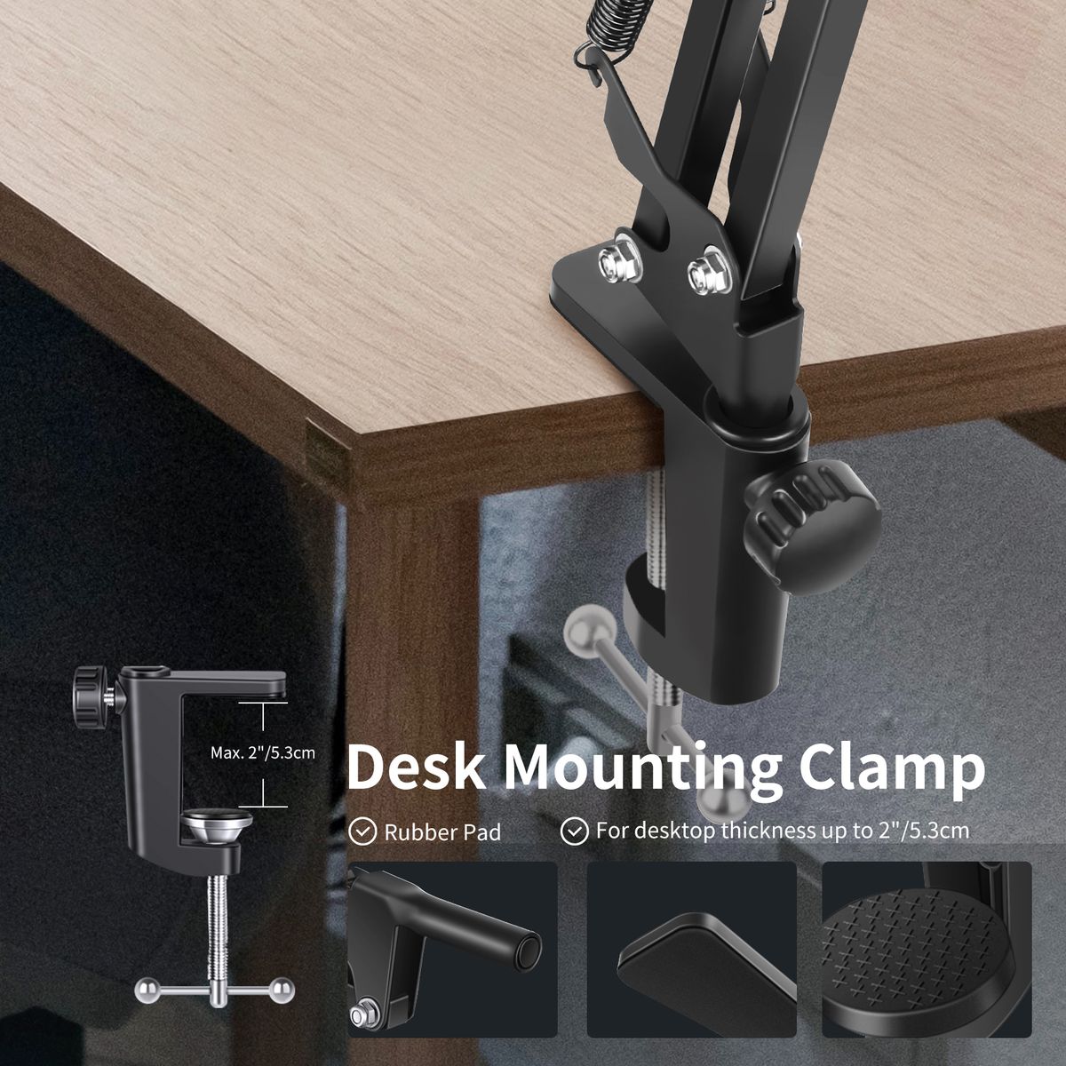 Desktop clip: The lightweight C-clip can be installed on a 5.3 cm (2 inches) thick desktop, and keep your desktop clean and tidy. Internal rubber pad protects the desktop from scratches and improves stability