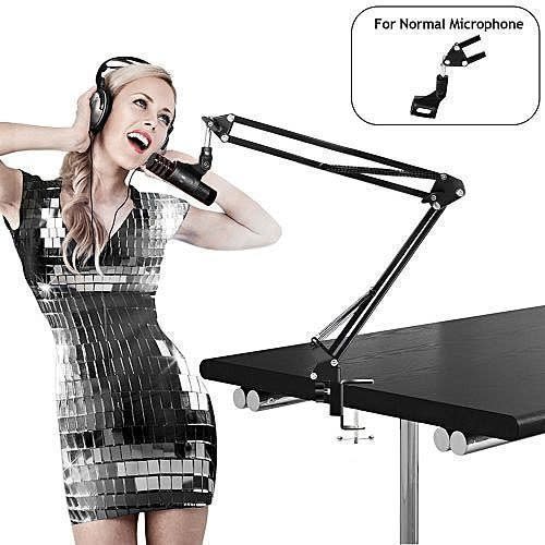 Professional Microphone Stand is a convenient and useful invention widely used in live broadcasting, podcast, solo artist, etc. With the upgraded heavy duty design, it delivers great load-bearing (More than 4.4 pounds / 2KG) and long-time performance. Moreover, the foldable arms allow you to carry it with you easily. Easy to set up and adjust the arm to your favorite position FEATURES -Suitable for Blue Yeti, Snowball, Blue Spark and other microphones. -Super-strong spring. -Comfort to pull and draw, fold out of the way you exactly need it to be. -Adjustable clamp for placement on uneven surfaces. -Great microphone arm for beginners. -Longer bracket arms, bigger table clamp mouth, best holiday gift to your family party, announcer, music lover. -Material: Premium Steel (Frame & Clamp) and ABS Plastic (Mic Clip) Arm -Length: 14.5"/36.83cm -Desk Clamp: 2.15"/5.5cm (Max) -Support Weight: More than 4.4 pounds / 2kg -Mic clip: More than 1.77 & rsquo; & rsquo; / 4.5cm Caution -Please hold both arms and slowly open first time. -The base is not fixed on the glass table -Microphone and Pop Filter in the pictures NOT INCLUDED