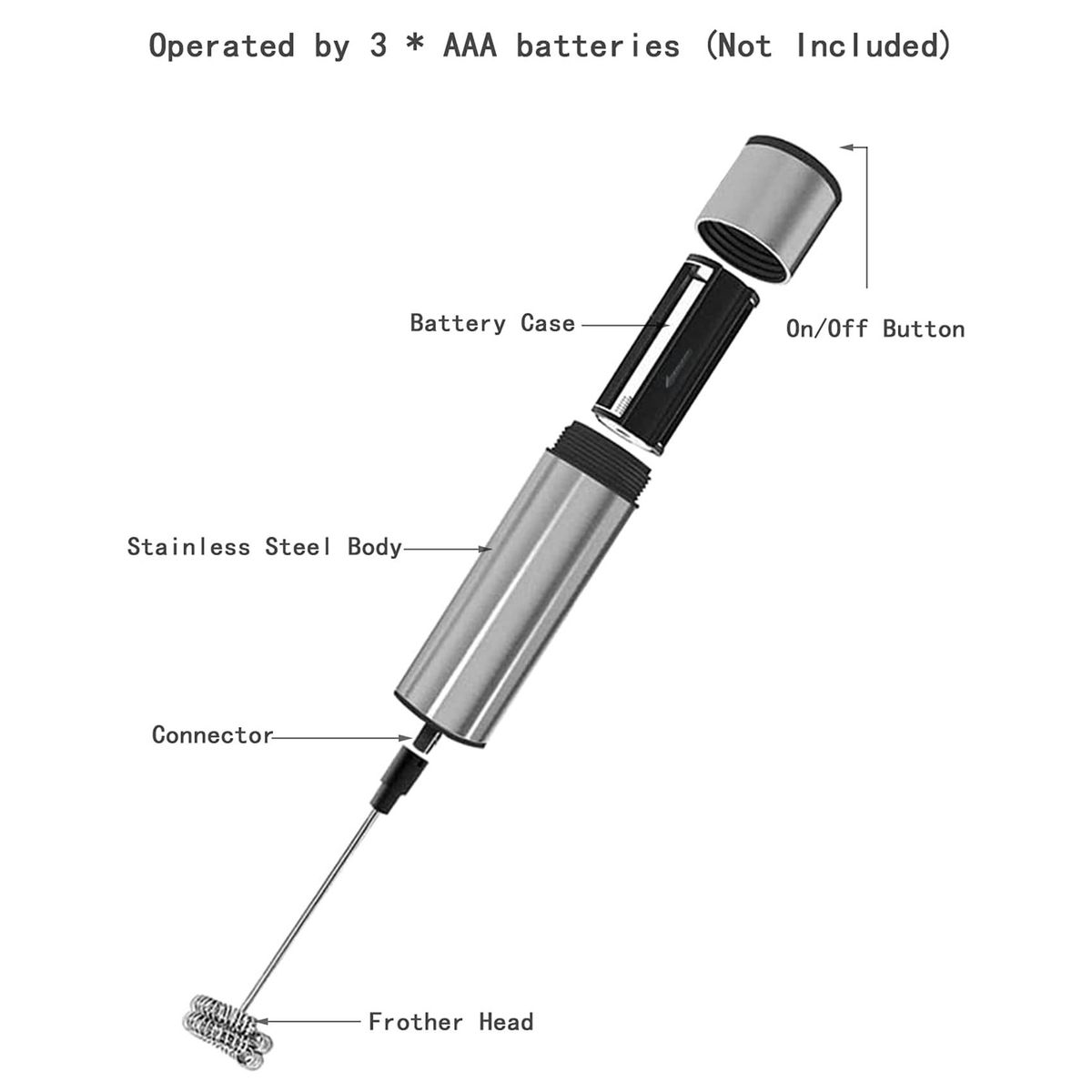 [Noise level]: The low-noise motor of the electric mixer hardly makes a lot of noise. Speed: about 19000RPM, no noise, and will not affect your normal life when used. The blender is powered by 3 AAA batteries, (batteries not provided)