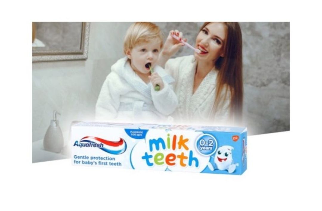 AQUAFRESH MILK TEETH GENTLE PROTECTION FOR BABY'S FIRST TEETH Is Specially Designed for Babies Aged 0-2 years and Should be used as soon as Baby's First tooth Emerges. It's tough on decay but also less abrasive than some regular toothpastes, making it especially kind to baby's teeth. It is sugar free and has a gentle minty taste.