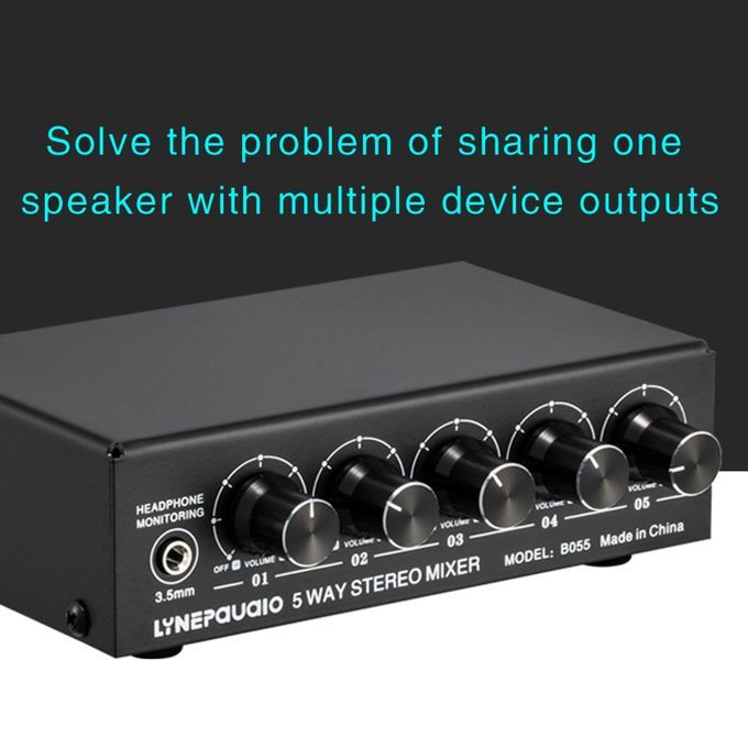 1 x USB power cordStereo Audio Mixer;5-Way Stereo Active Mixer Multi-Channel Mixer;Audio Mixer with Headphone Monitor Portable;5-Channel Mixer 20Hz-20KHz Mini Low-Noise Black;Independent Volume Adjustment Multiple Input Port