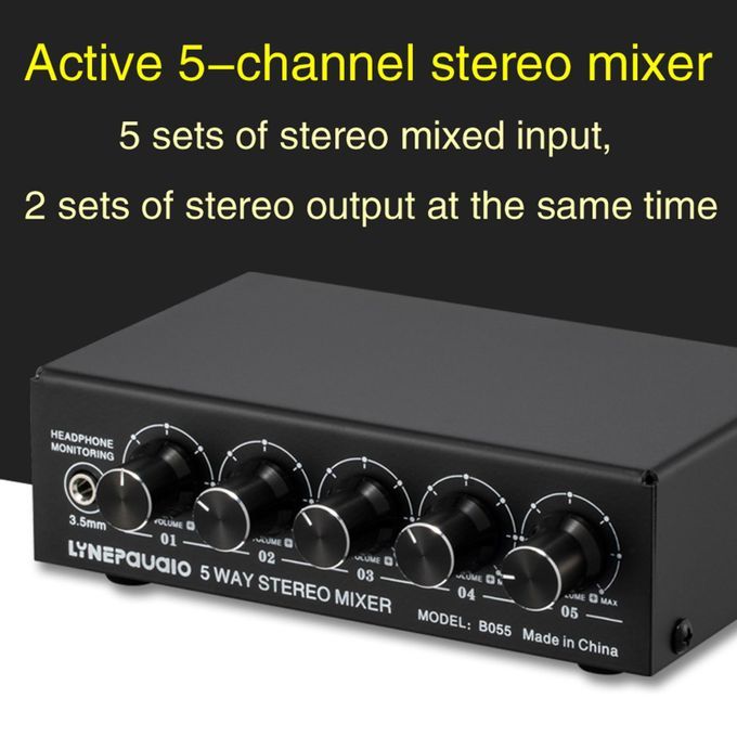 Mini Active Stereo Mixer is a 5-way active stereo mixer for extended control of tuning, mixing instruments, CD players, tape players, computers, mobile phones, tablets, etc. It is compact and thin desktop mini design, compact in size, compatible with any device