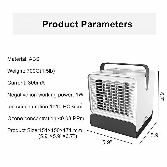 Description:Brushless motor with high speed and low noise, stable and quiet design, soft sound and low noise, wind and sound clear does not affect sleepAfter precise operation, the cold air is released, and the temperature is accelerated by 3-10 °C. The private space can be kept cool for 25 °C for a long time.A set of fans, humidifiers, purification and cooling integrated cooling fansWaterless state can be used as a fanAdd water to use when humidifyingAdd water + ice crystal state to double the coolWater and ice cubes in the soft air tank of the air-conditioned refreshing fan Specifications:Low noise: as low as 36dB (A)600m3/h high air volume1800ml/h large evaporation150ml integrated water tank for cool and humid for 8 hoursMaterial: ABSCurrent: 300mANegative ion working power: 1WIon concentration: 1X10 PCS/cm3Ozone concentration: