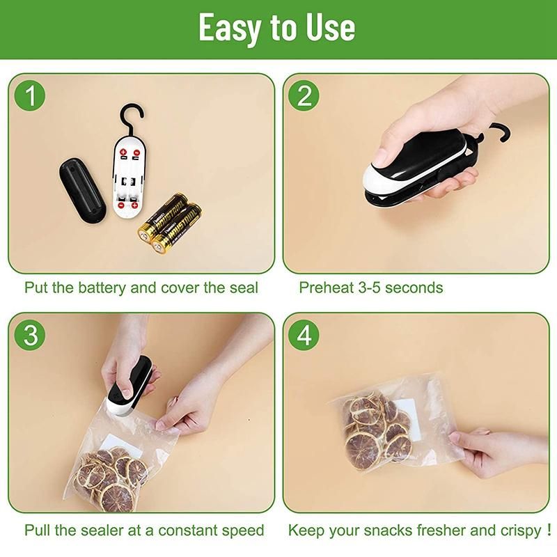 [Please Note]The pure paper bags and aluminum foil packaging bag are not suitable. This mini bag sealer needs 2 X AA batteries (not included). Please remove the battery if it is not used for a long time