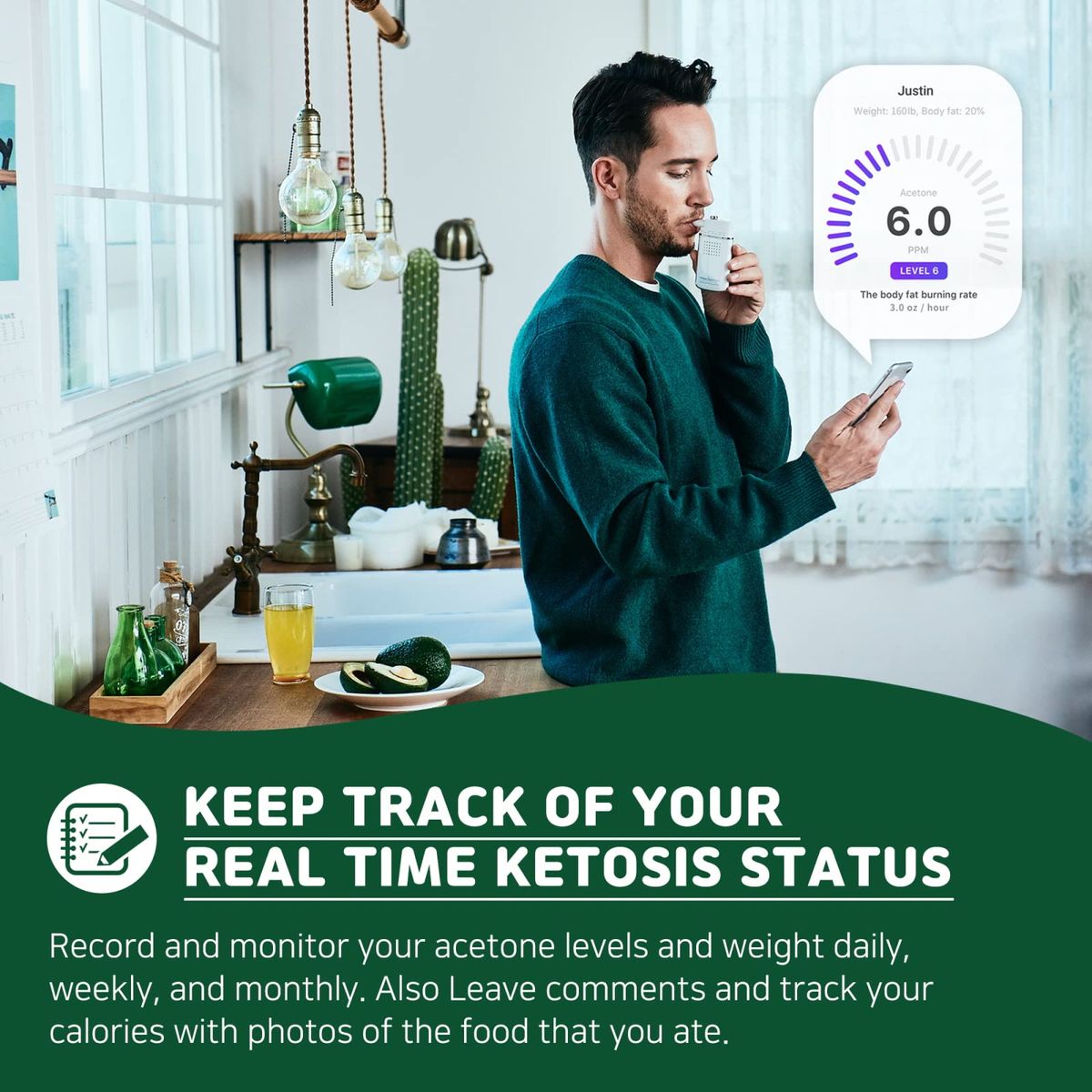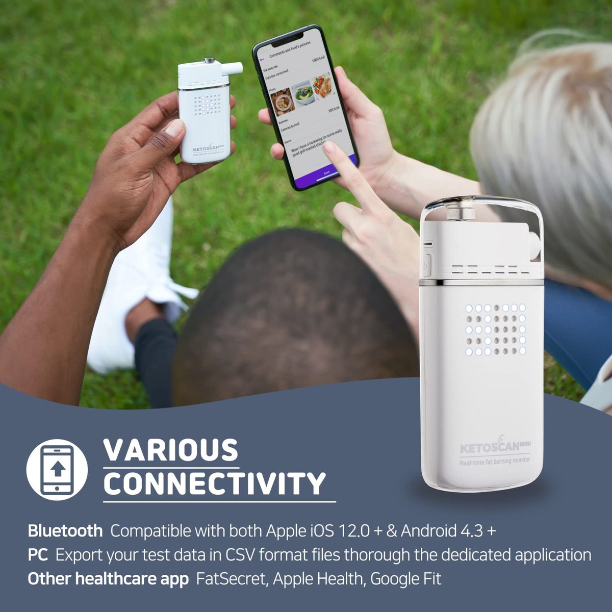 MOBILE APP. CONNECTABLE: Record and monitor your acetone levels and weight daily, weekly and on a monthly basis. Also Leave comments, and track your calories with photos of the food that you ate.