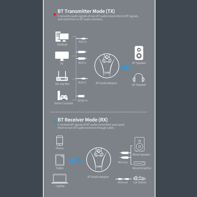 This BT Audio Adapter supports transmitter mode and receiver mode, and equips with multiple interfaces, enabling you to make full use of existing non-BT audio receivers and transmitters. Besides, it also supports NFC function to quickly connect with your phone.