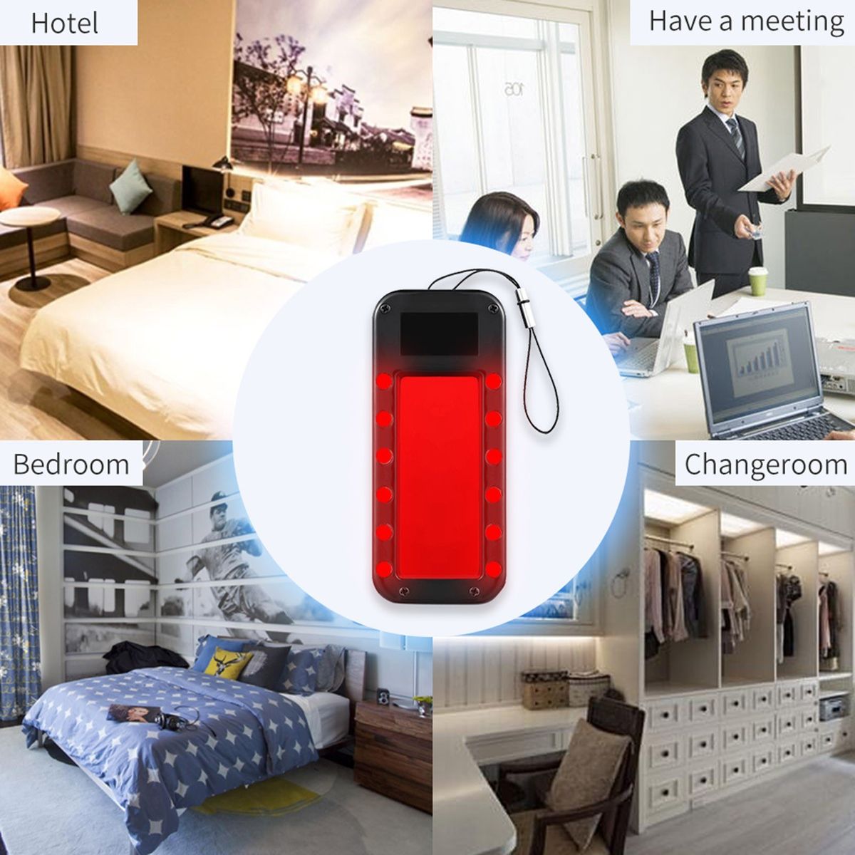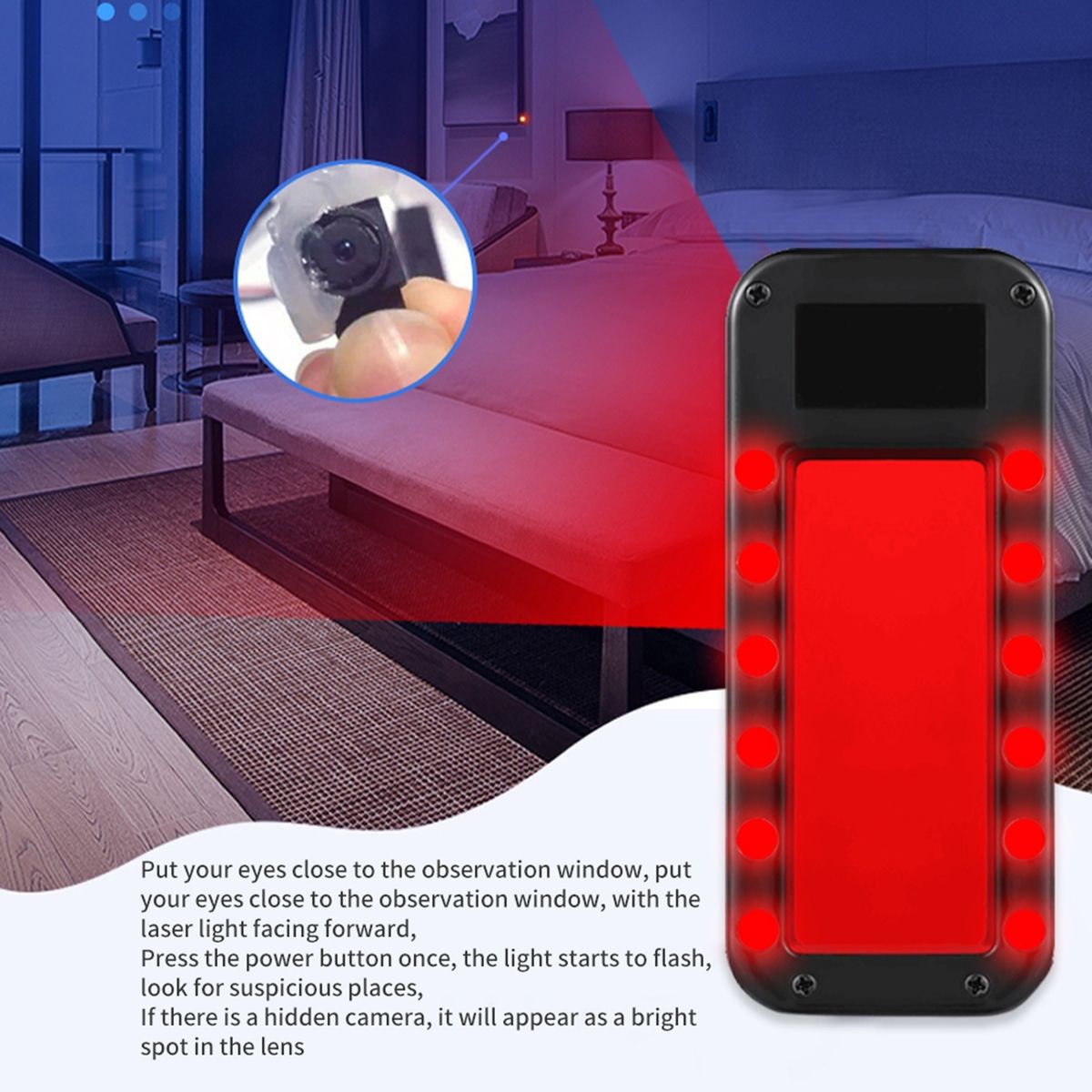 Put your eyes close to the observation window, with the laser light facing forward, press the power button once, the light starts to flash, and look for suspicious places. If there is a camera, it will be shown as a bright spot in the lens, so it will be found.