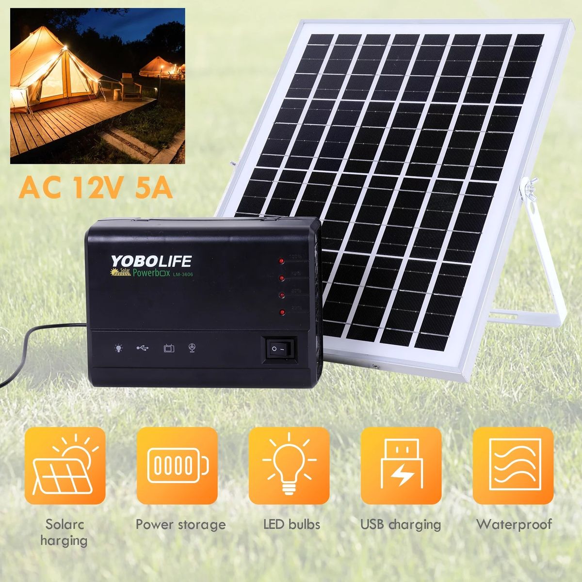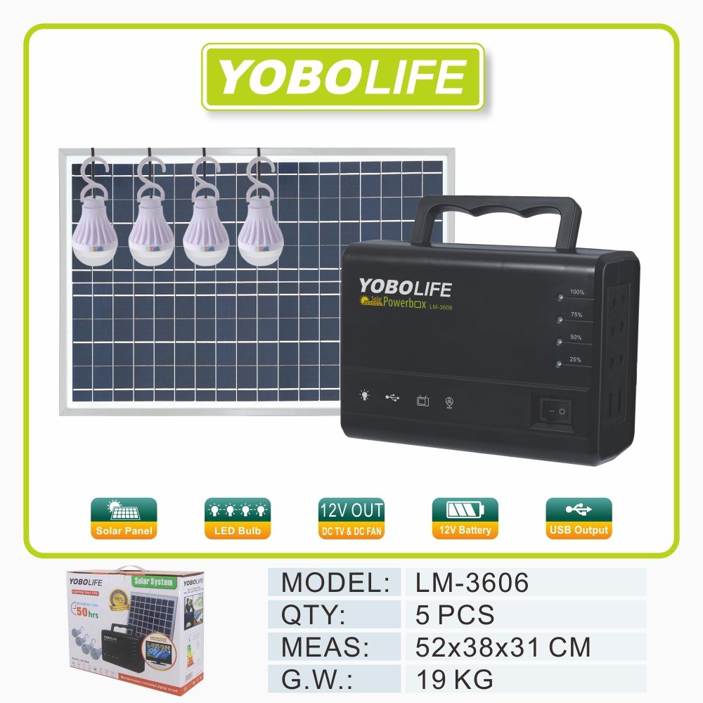 Model NO.: LM-3606 Illumination Time: 10-20 Hours Cell Type: Lead Acid 12V 5A Battery Charging Time (H): 10HoursUsage: Garden, Street, Home Voltage: 12/24VLED Bulb Quantity: 4 PCS Solar Panel Power: 15 W Battery Size: 3.2V 5200mAh Color: Black+AC Wide Voltage: 110-240V DC Voltage: 12V USB Output: 5V 2.1A
