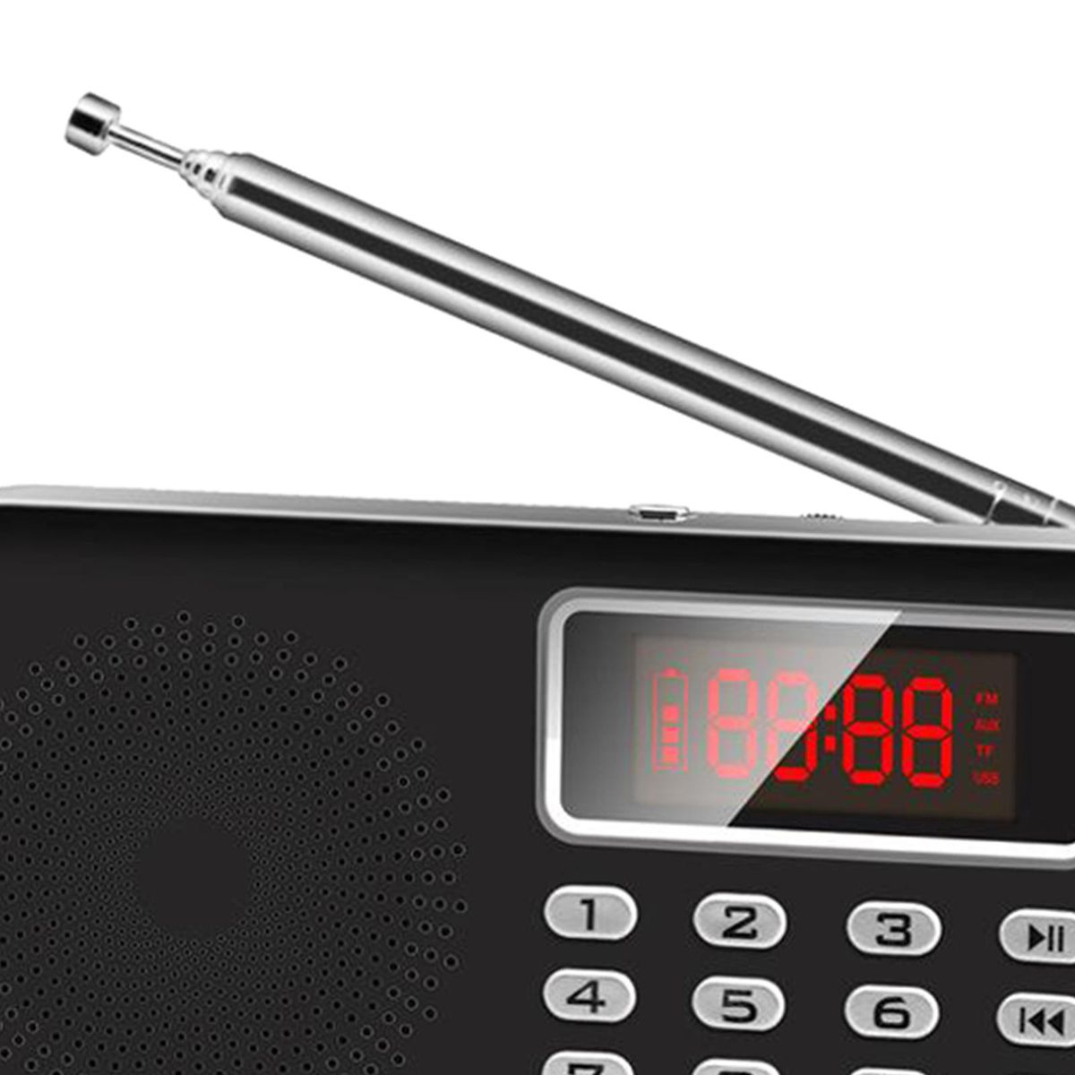 Functions: AM/FM Radio,LED Flashlight, USB Play, U-Disk, TF card play, AUX,MP3 playerUpgraded radio IC and ultra long antenna make it have strong AM FM signal, even in remote places.Long press the pause key to automatically search and store the radio station.Built-in magnetic speaker and bass protection layer, real stereo perfect sound quality; large-capacity battery, when the battery is full, the maximum volume can be played for about 3-4 hours, normal volume can work for about 5-6 hours, or even 8 hours, the battery capacity is 1000mahWith standard 3.5mm earphone , available for earphones to listen to radio and music; with audio line in , can easily and perfectly to connect to your computer, MP3, MP4,mobile phone, etc;With power display, flashlight, freely retractable antenna, large volume, Be available to select radio channels and MP3 music with 0-9 number buttons