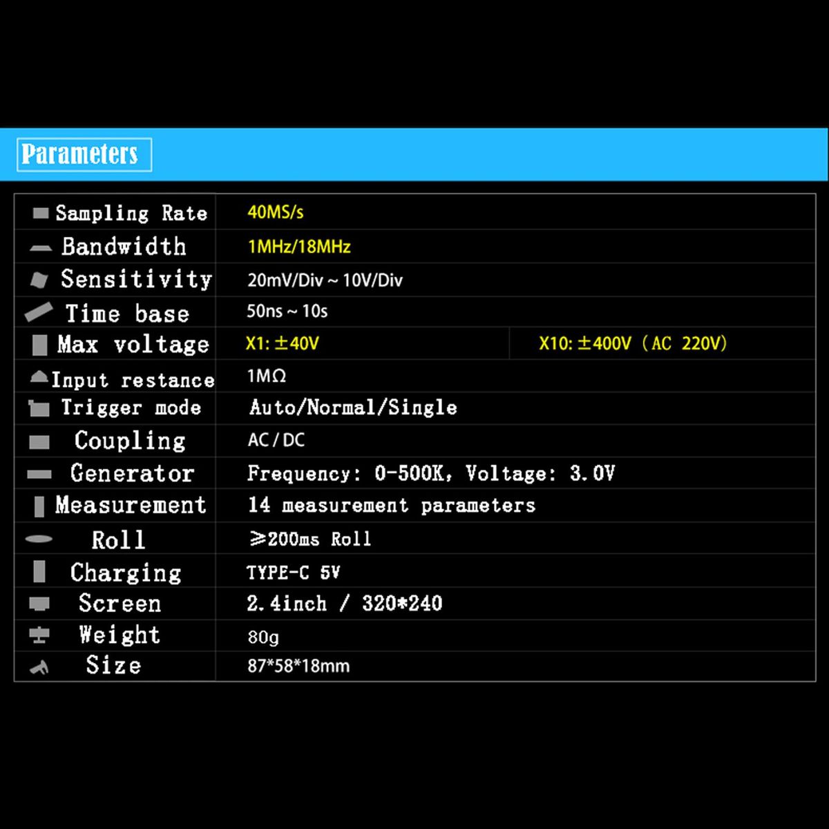 【Digital Oscilloscope】real time sampling rate 40MS/s, 18MHz. Complete functions (automatic, single, regular), equipped with 8 buttons design, easy to operate.