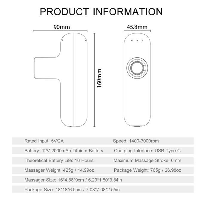 Massager Size: 16*4.58*9cm / 6.29*1.80*3.54in