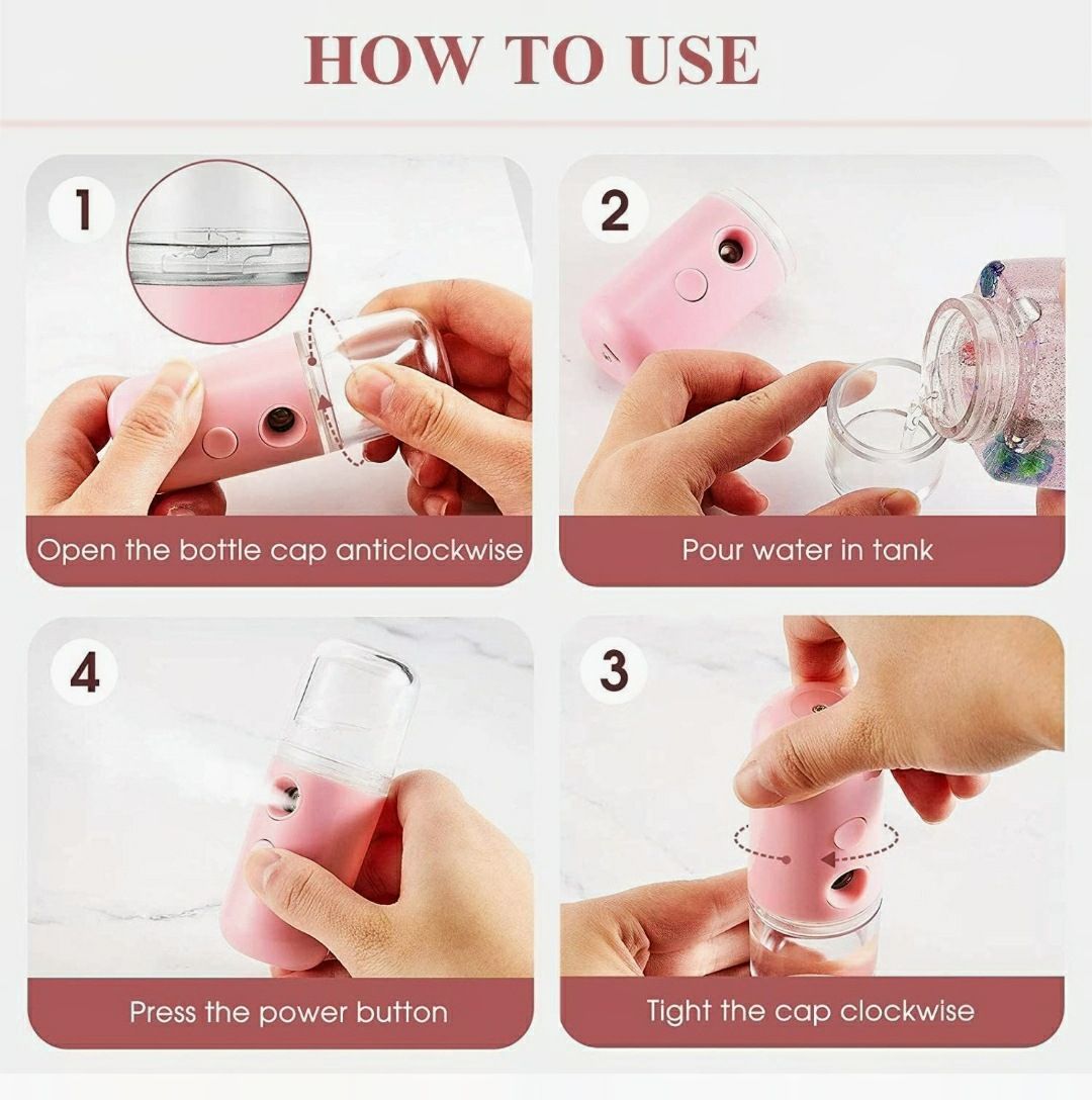 Features & detailsLarge capacity: the 30 ml storage volume can be applied about 16 to 18 times, no need to add water frequently, when there is enough water, it can be applied for 20 minutes without interruption; It can produce a lot of small water, mineral water help enhance the function of this battery-powered the portable face steamer, and it can last all dayOperate easily: this portable mini face humidifier is easy to operate, when you need to use it, just fill it with mineral water, and then press the switch, it will automatically emit a soothing cool feeling, USB charging is also easy to use, satisfying your daily needswater replenishment: it can be applied to nourish your face, body, hair, and can be applied as an eyelash extender, it is suitable for most skin types; The mineral water will help enhance the function of this battery-powered water replenishment product, and it can last a long timeEasy to carry: our product is small in size and easy to carry, this USB handy skin care machine can bring you convenience whether you are going shopping, traveling or on business trips, it will make you feel relaxed and cool in the hot summer and keep the skin hydrated in winterYou will get: the package includes 1 piece facial humidifiers in classic colour pink, with a volume of 30 ml, which is suitable for home or going out, it is equipped with 1 USB charging cables for easy replacement, the USB charging design makes the charging process easier.