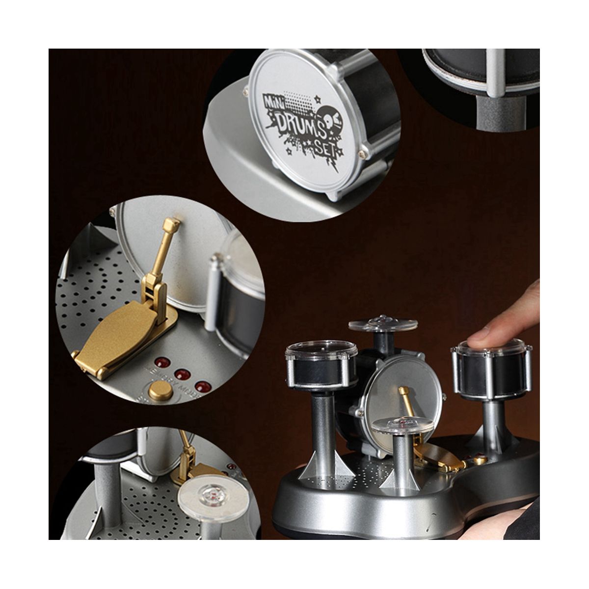 This product can help you! Mini Finger Drum allows you to become a little musician, flying with of the finger drum during drumming and percussion. Just by beating, you can feel the sounds of different instruments such as treble drums, snare drums, bass drums, and cymbals. (Need to buy 3 AAA batteries)