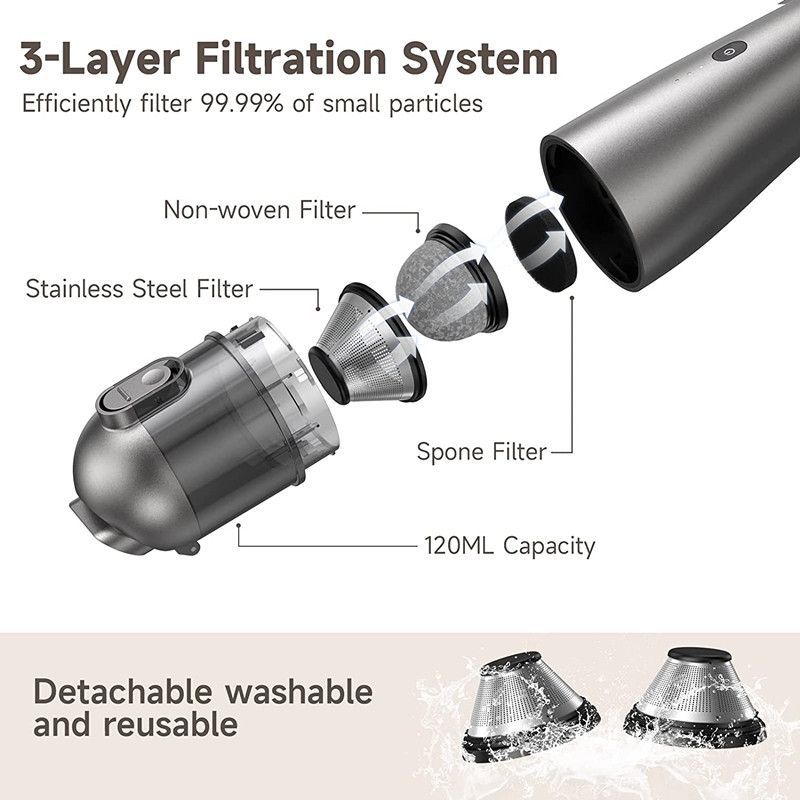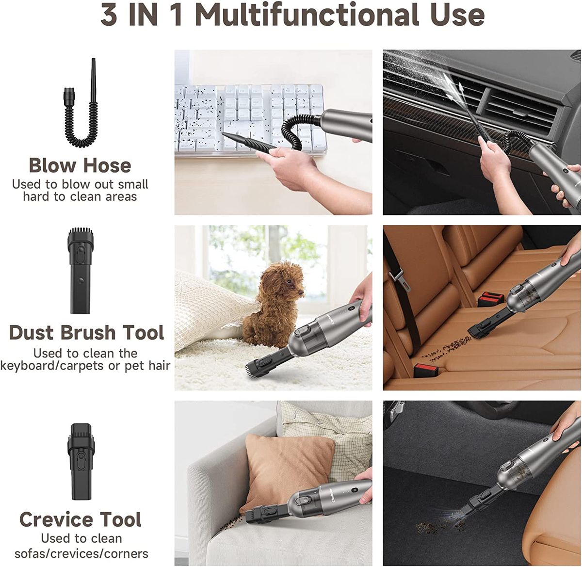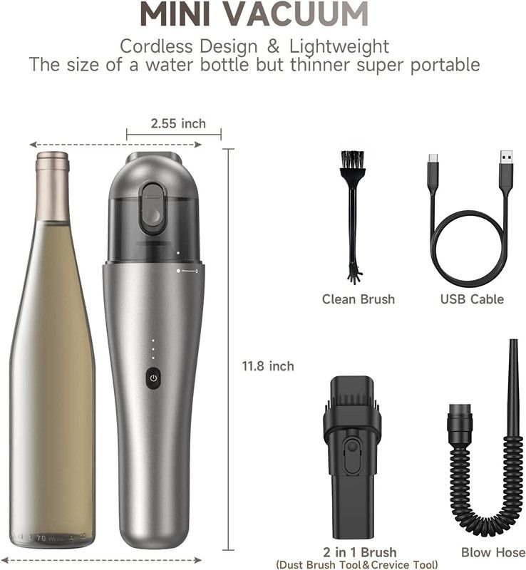 Completely portable and wireless! Mini Size For Quick Clean Up. This handheld vacuum cordless rechargeable cleaner boasts a powerful 6000pa suction that can effectively remove dust, cereal, pet hair and other debris. The wireless design let you take it anytime and anywhere, providing you with maximum flexibility and convenience.Equipped with 3*2000mAh batteries and can be fully charged in 3 hours, this mini rechargeable car vacuum can provide up to 25 minutes of continuous use on a single charge, which is enough to clean the corner of home, car or office, it allowing you to quickly resume cleaning when needed, providing you with a highly efficient cleaning experience.The 2-in-1 nozzle can be connected to the top of the vacuum and used with or without a brush, making it a crucial accessory for dealing with carpets, pet hair, and debris. The Flexible Extension Hose Attachment connects to the bottom of the vacuum and is capable of reaching narrow gaps and corners to effectively remove dust. Weighing only 1.32lb. One-click dust removal design helps you dispose of dust more easily without making your hand dirty.This hand held vacuum is eqquied with 3-layer detachable, washable, reusable filters, which can filter 99.9% of dust and protect the motor from the damage of small particulars. An extra filter is included as a bonus, so you can change the filters anytime. This car vacuum cordless rechargeable features a sound-absorbing sponge, reducing the noise level to under 65dB, and the vacuuming process will not disturb children, the elderly, or scare pets. Give the gift of pure enjoyment to friends and family members.1 *