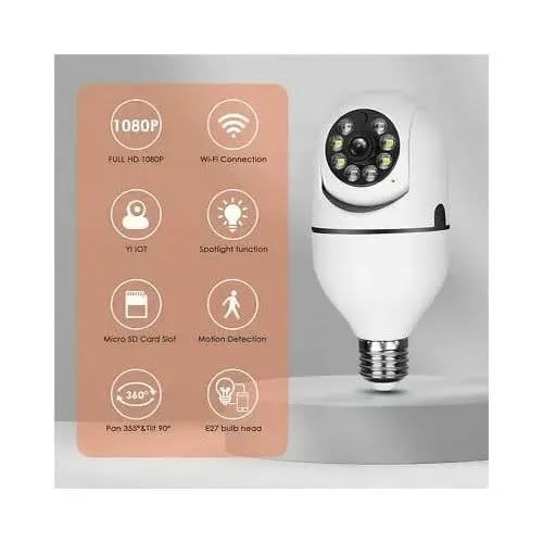 This 360Degree Rotation bulb Shape camera is a 360-degree view angle fisheye panoramic wireless security camera Full 1280 X 1080p HD, wireless Wi-Fi (Not Support 5G Wi-Fi) Day and night vision & motion detection. Best security system for your house!Note: 1. Wifi Frequency: 2.4 GHz(Don & rsquo;t support 5G wifi). Please place where the wifi signal is strong 2. TF card is needed but not included (support min 8G, max 128G) 3.If you want to use it outdoor, please be sure: A)The bulb camera needs shelter cause it & rsquo;s not waterproof. B) The bulb camera needs a bulb socket to connect it. If you can use a bulb outdoor then you can use this camera too. C)The bulb camera needs wifi connection, Please place where the wifi signal is strong Don & rsquo;t worry whether your kids are safe with babysitters. Don & rsquo;t worry about what your pet doing while you are away. Don & rsquo;t worry your home is secure while you are away.CCTUNG Wireless Security Camera helps you reduce worries and increase home safety