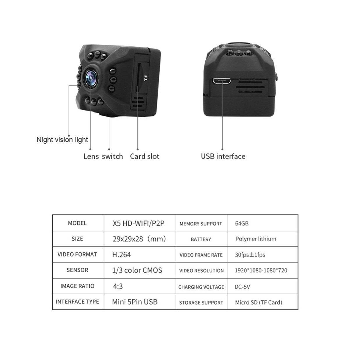 The high-definition wide-angle spy camera has a broad field of vision. Night vision infrared light can shoot high-definition images at night or in dark environment, and the night vision distance is 5-10 meters.