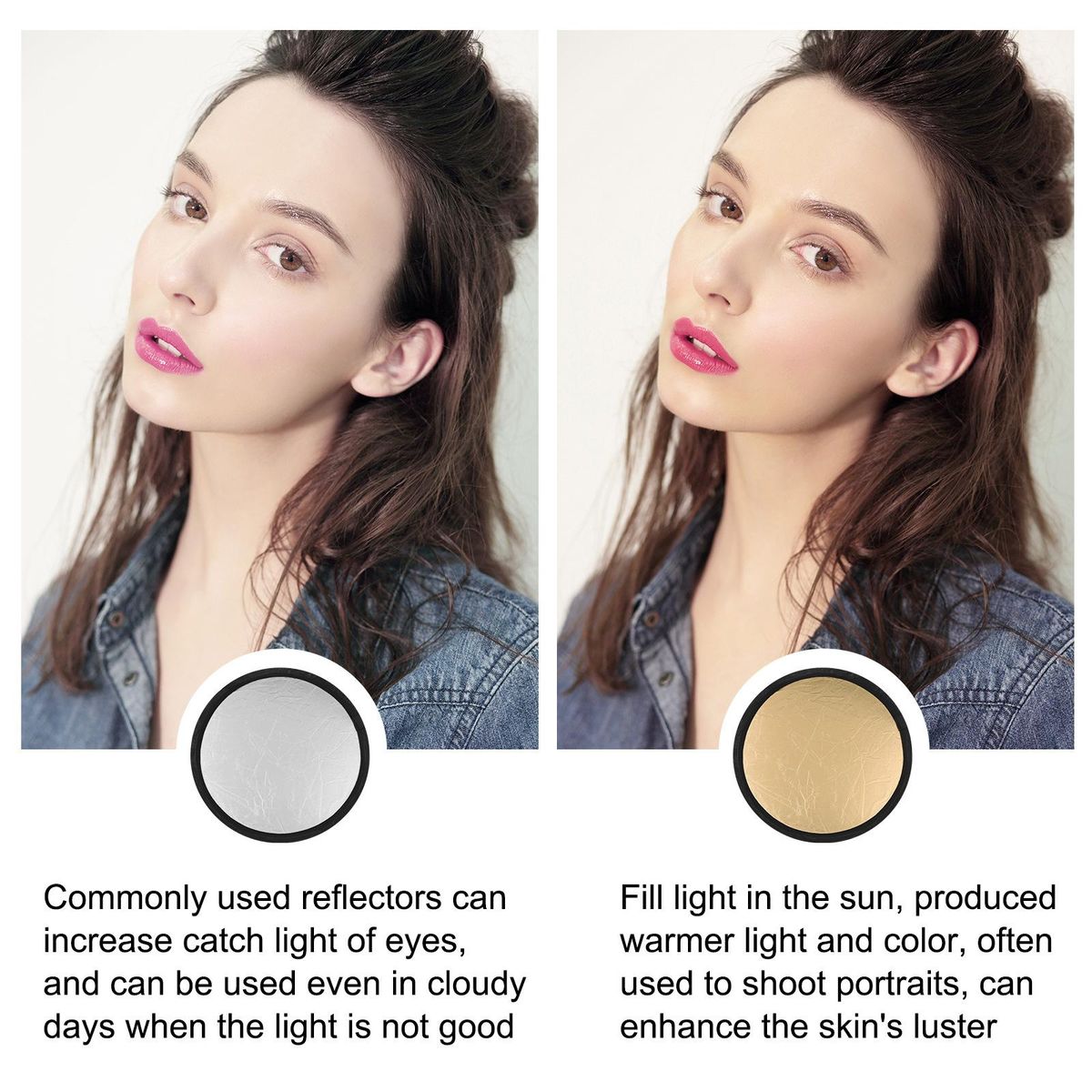 2 in 1 reflector: Gold creates a sunset effect that makes warm and soft skin tones; is used to enhance the light in low light situations.