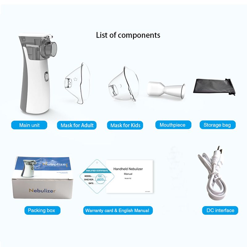 1 x Mesh Nebulizer 1 x Adult Mask 1 x Child mask1 x Mouthpipe1 x Package box1 x English Manual