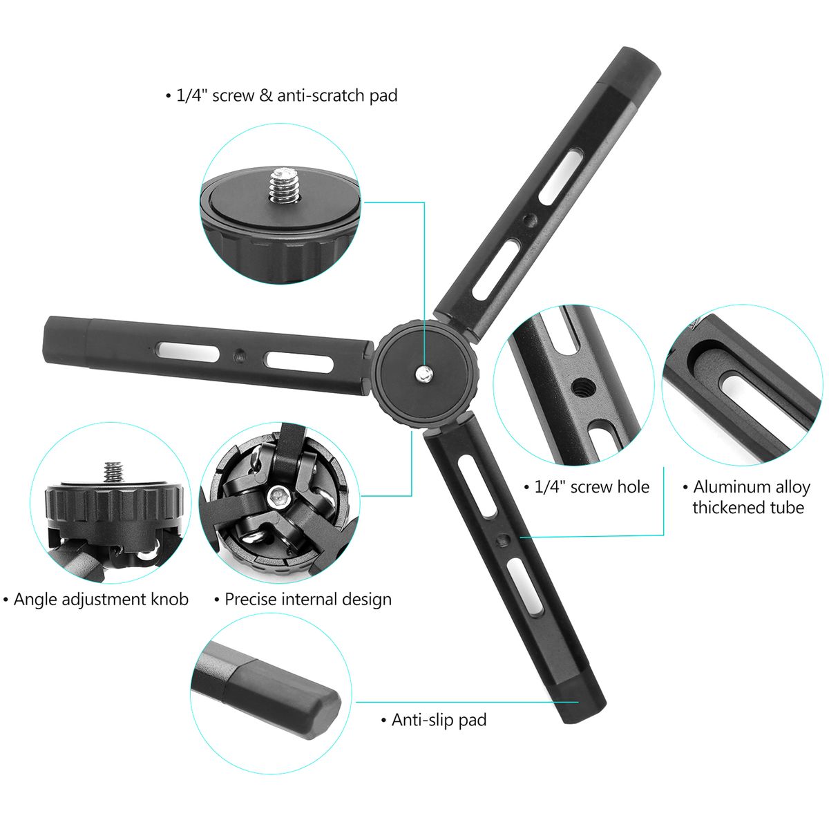 1/4 inch screw hole design in the thickened tripod feet, offering access for external accessory attachment like photography light.