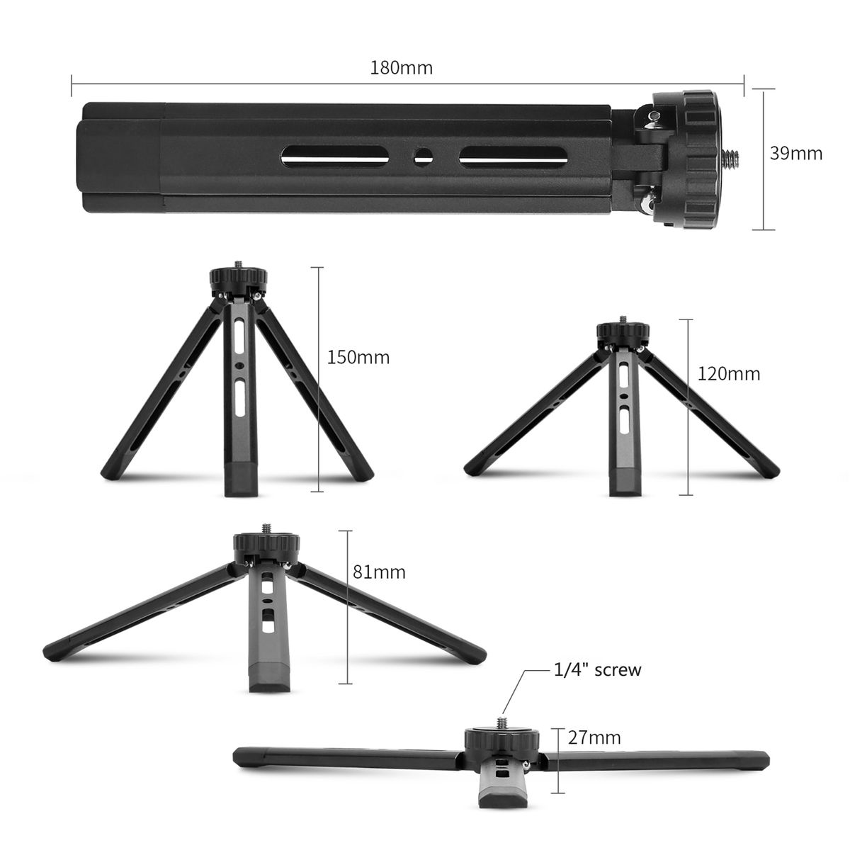 Tripod Height: 27mm/ 1.06inch, 81mm/ 3.18inch, 120mm/ 4.72inch, 150mm/ 5.90inch