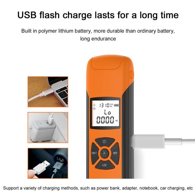Features: 1. Universal port: su orts S , F , ST three ommon opti al fiber interfa es, plug and play. 2. Seven wavelengths and smart memory: Short press the key to swit h between 7 test wavelengths to meet various test requirements. The last test wavelength is automati ally saved when shutting down. 3. lighting: flashlight lighting fun tion, easy to he k the line onstru tion in the dark environment. 4. Long-lasting battery life: Built-in polymer battery, it an be used 3 0 times with a full harge. 5. USB flash harging: su orts multiple harging methods su h as power s, adapters, laptops, and ar hargers.