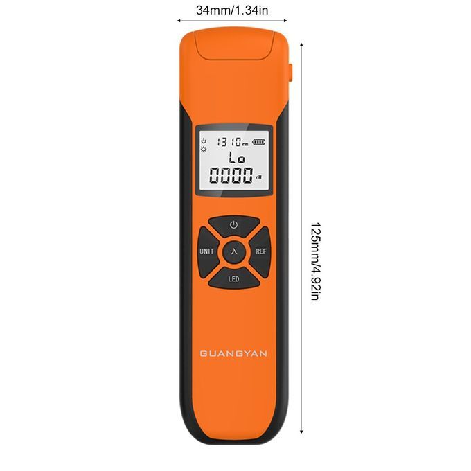 Spe ifi ations: Measuring range: -70~+3dBm, -70~+10dBm (optional) Wavelength range: 800~1700 Probe type: InGaas Un ertainty: ±5% Display resolution: linear display: 0.1%, logarithmi display: 0.01dBm Frequen y identifi ation: 0Hz, 270Hz, 1000Hz, 2000Hz Standard wavelength: 8 /980/1300/1310/1490/15 /1625nm Quies ent urrent: ≤18uA Life time: ≥20H harging urrent: ≤ 0mA Automati shutdown time: 10 minutes Battery apa ity: 400mAh Working urrent: ≤25mA harging voltage: 5V harging time: ≤3H Power su ly: built-in battery, USB port Size: 34*17*125mm