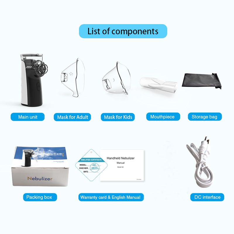 1 x Mesh Nebulizer 1 x Adult Mask 1 x Child mask1 x Mouthpipe1 x Package box1 x English Manual