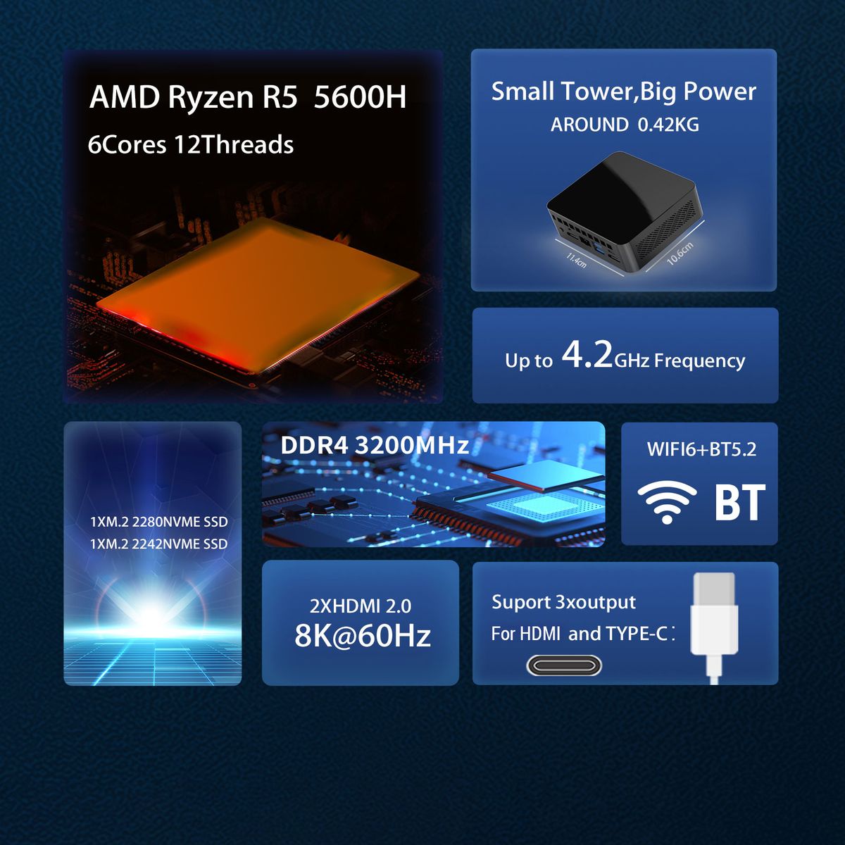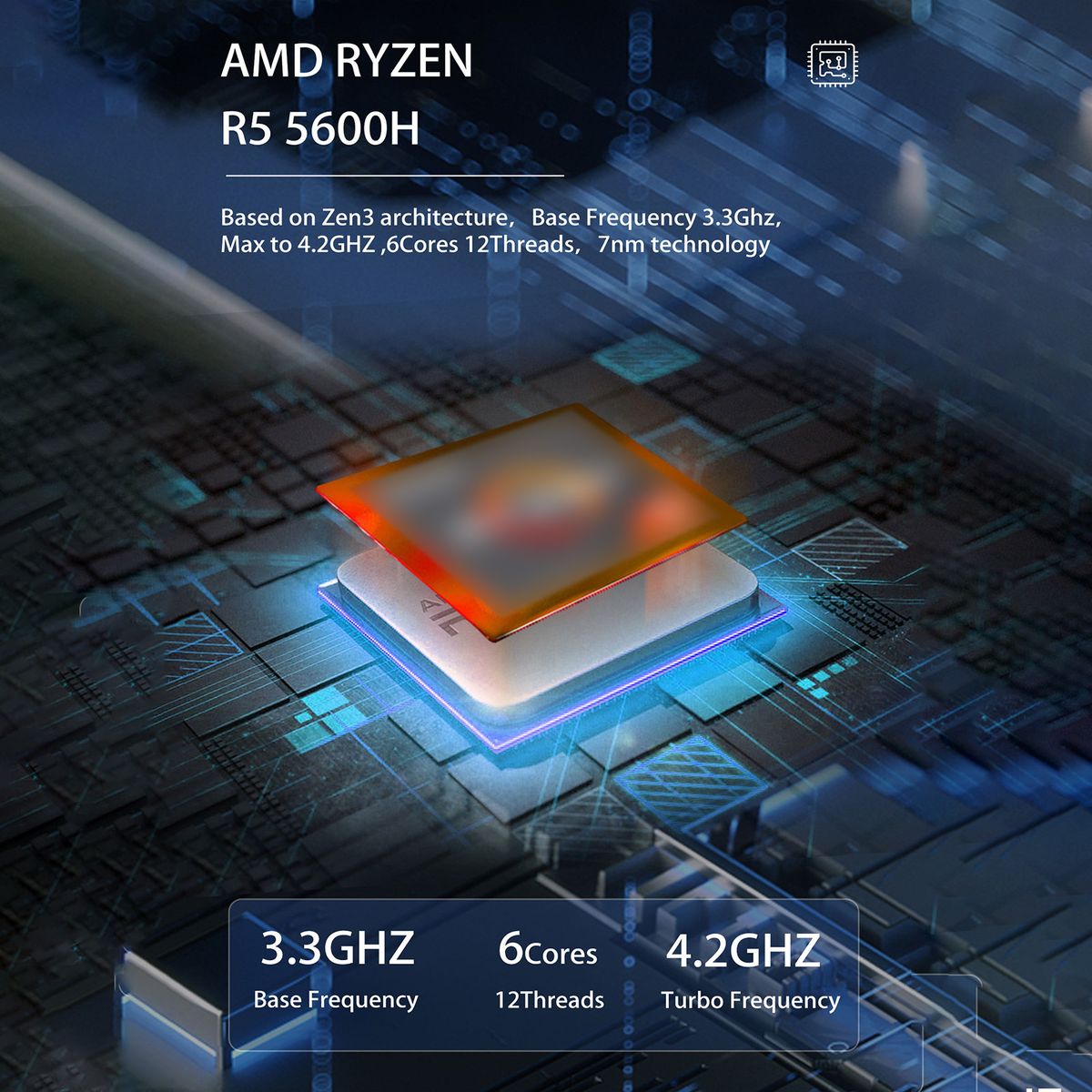 Features: High-performance Processor: The product is equipped with an AMD Ryzen R5 5600H processor, which has 6 cores and 12 threads, and the highest frequency can reach 4.2GHz. It can easily handle various high-intensity computing tasks, whether it is office work or gaming.