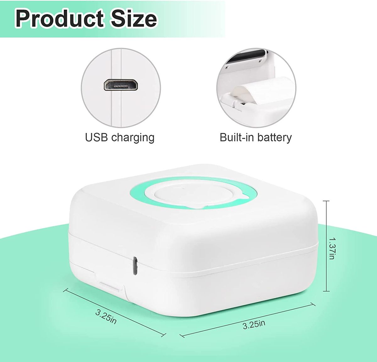 Equipment Specification:Product size: 80 x 80 x 35 mmProduct Weight: 160gPower supply: 1200 mAhInput voltage: 5VClarity: 200 dots per inchPrinting method: thermal printing without inkVisualization method: Black and whiteDuration of the photo: 1 yearPrint paper size: 57 x 30 mm
