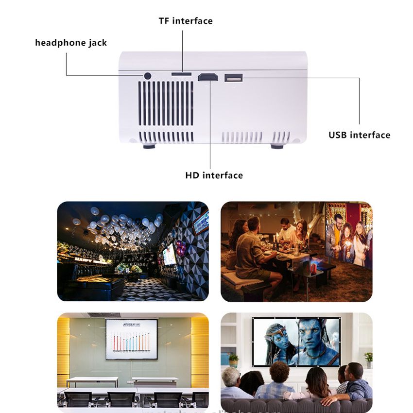 Video projector with HDMI /VGA/ USB / AV / Micro SD card / 3.5mm port, Support video formats MP4, MOV, 3GP, AVI, FLV, M2TS, MKV, MPG, RMVB, TP, TRP, TS, WMV, VOB, DAT, ASF;Supports audio formats MP3, WMA, MP2, OGG, M4A, FLAC, 3GP, WAV, M3U, RM, WMV;Support image formats JPG, JPEG, BMP, PNG,meet your multiple demands .