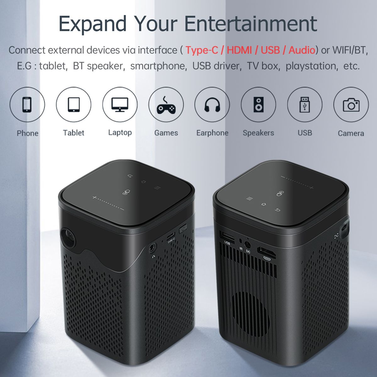 Expand Your Entertainment: There are various interfaces are provided on the back of the projector. Connect external devices via interface (Type-C/ HDMI/ USB/ Audio) or WIFI/bt, E.G: tablet, bt speaker, smartphone, USB driver, TV box, playstation, etc. Android 9.0 operating system, free to download and compatible with plenty of applications.