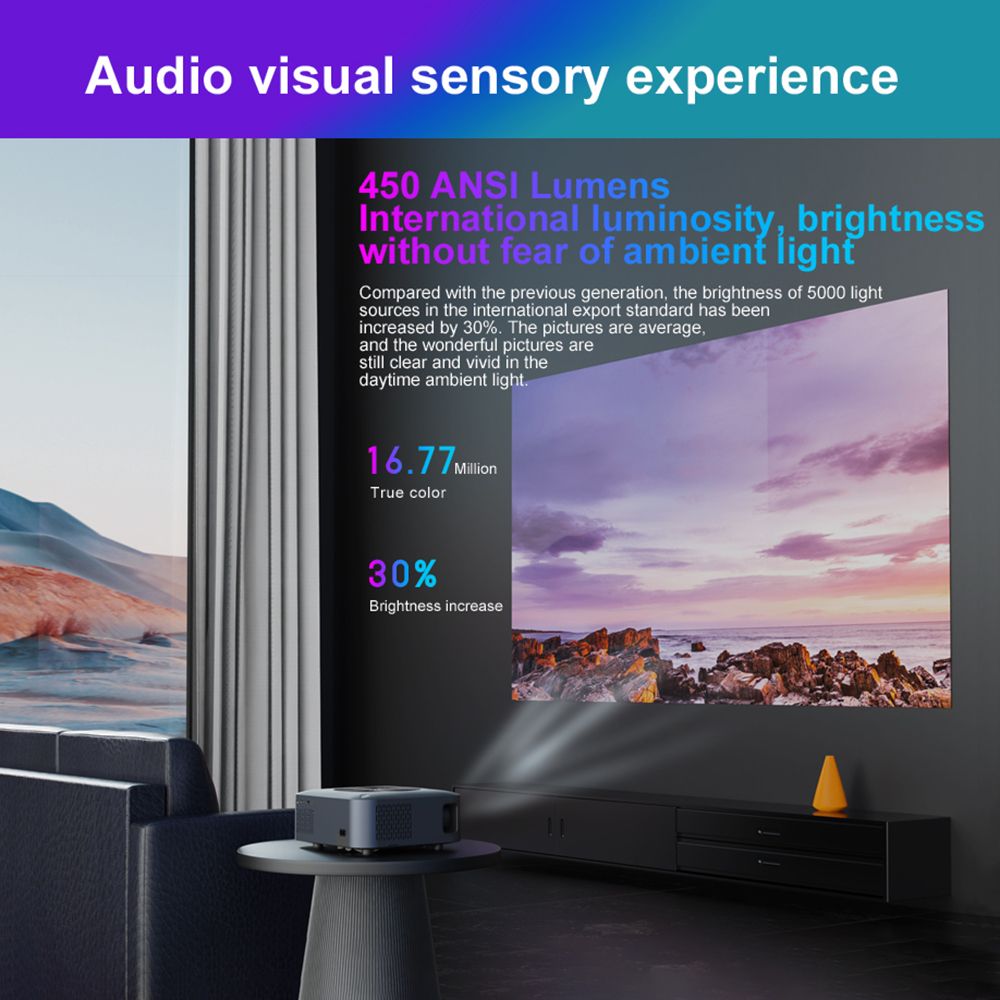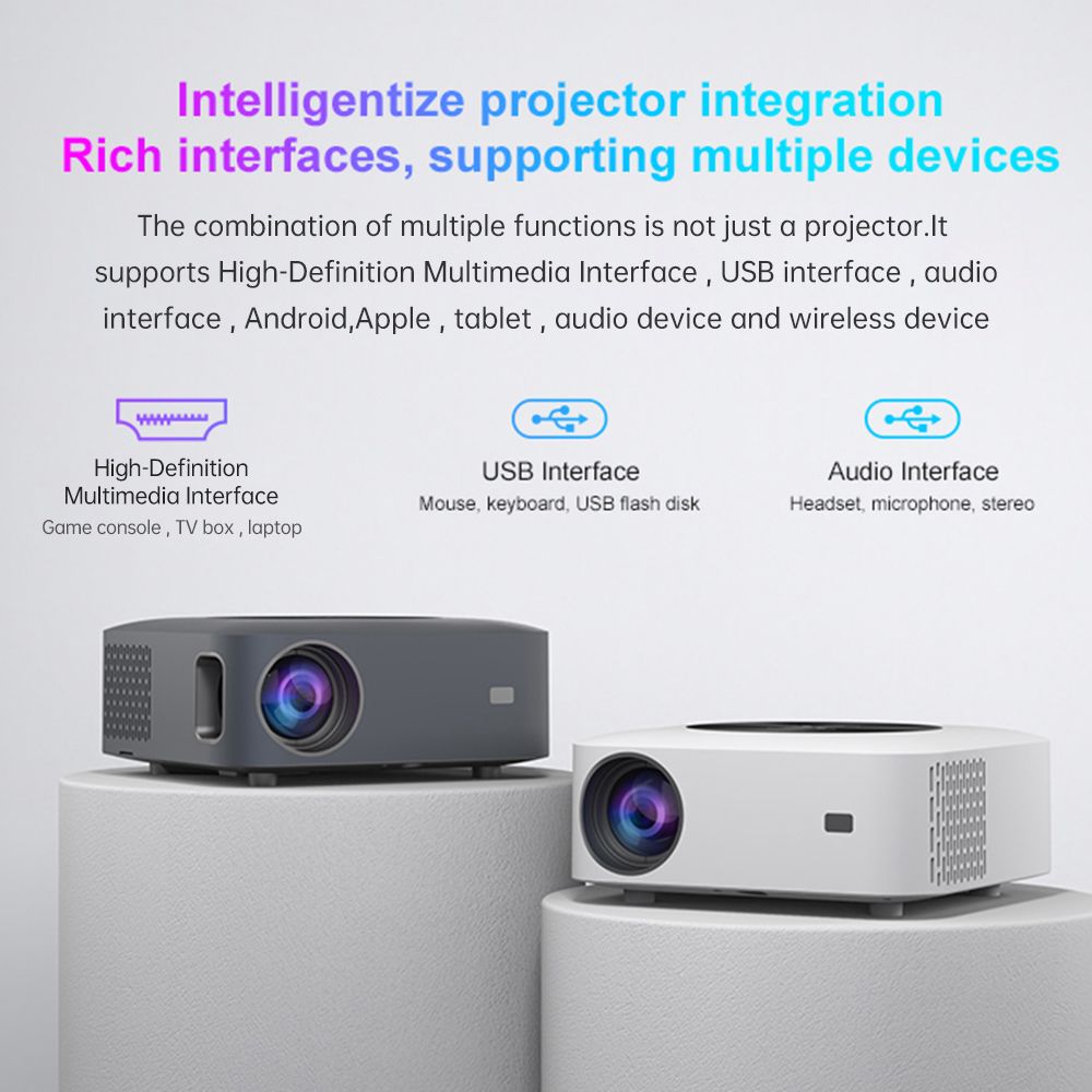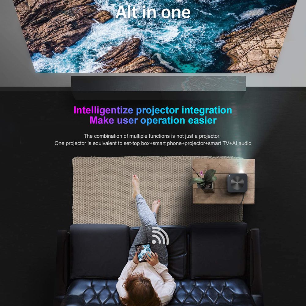2.4G& 5G Dual WiFi & BT function for Multiple Devices: Not just a simple projector. The combination of multiple functions is not just a projector. One projector is equivalent to set-top box+smartphone+projector+smart TV+Al audio. It supports HD interface, USB interface, audio interface, Android, iOS, tablet, audio device and wireless device.