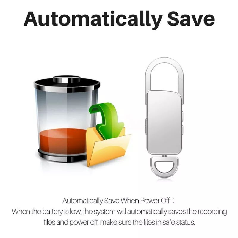 Description: This is a digital voice recorder with 8GB/16GB large internal memory, easy to use, it looks like a keychain. You can use regularly as a key chain and record audio when needed just by sliding the power on on. Just slide the power on on and it's ready to use! Specifications: Flash Disk Capacity: 8GB/16GB (Optional) Color: Silver/Black (Optional) Material: Metal & Plastic Recording Bit Rate: Default 192Kbps Recording Format: WAV Music Format: MP3 / WMA / WAV Power Supply: Built-in 3.7V/85mA Lithium Battery Item Size: 8.5 * 2.5 * 1cm / 3.3 * 1 * 0.4in Item Weight: 49g / 1.8oz Features: COMPATIBILITY WITH MA C AND WINDOWS - Compatible with Ma c or PC and forget about old clunky software folks, this digital audio recorder is easily transfer files to Ma c or PC. (Note: Ma c users need VLC Media Player, which is a free download) SUPERIOR RECORDING QUALITY - The voice recorder records at 192kbps, captures up to 20 ~ 50 ft and captures clearly clean audio that you can listen to by using the earphones included in the box SIMPLE AND EASY TO USE - Just turn the voice activated recorder to on, this usb voice recorder used as keychain which makes it a perfect device for covert recording. Ideal for busine, school, lectures and personal dictation. Disclaimer: Format types are MP3, WMA and WAV files. MP3 PLAYER AND LONG TIME RECORDING - Used as MP3 player and mini voice recorder - Features 8GB of internal memory let you store up to 96/192 hours of recording, supports 20 hours of continuous recording. MULTIFUNCTIONS - This voice recorder has so many useful functions including instant playback mode, advanced noise reduction and voice activated recording to give you the best audio quality poible no matter what you want to record. Our recorder basic look allows you to covertly record anywhere, claes and lectures, meetings, interviews, sporting events, concerts and more! It takes le than 10 seconds from the time it is switched on to start recording and once saved you can instantly play back any file, or any part of a file you want! ENJOY MUSIC - It does more than just record! You can also enjoy yourself anytime when you are wearing Digital Voice Recorder Watch to instantly play your music with your own MP3s Package includes: 1 x Keychain Voice Activated Recorder 1 x USB Cable 1 x Earphones