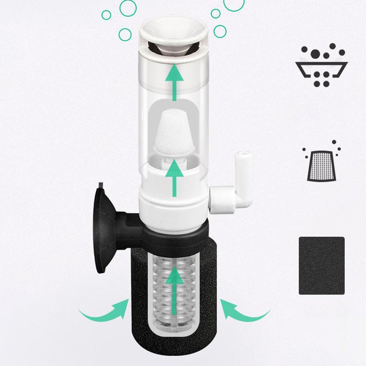 【 Sponge Filter】 Strong suction force, can be installed anywhere on the fish tank glass. Do not use an oversized air pump to avoid uneven mixing of water and air.