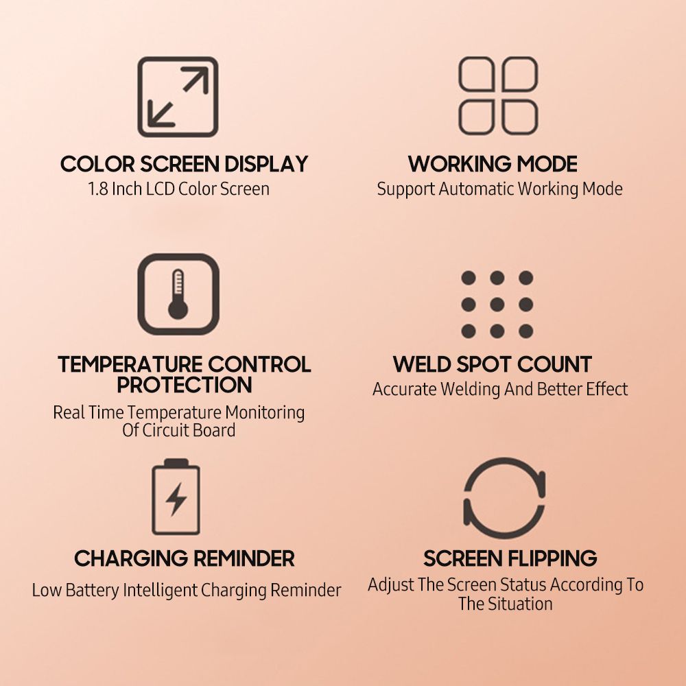 1. Color LCD Display: the 1.8-inch LCD color display can view the input current, battery power, circuit board temperature, pulse time gear, weld spot count and other data.