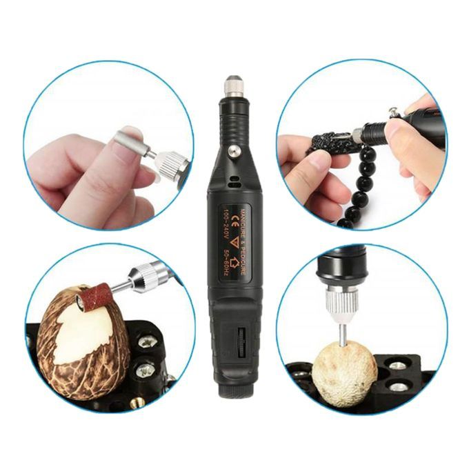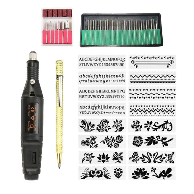 Each set contains 1x Pen, 1x Scriber Pen, 16x stencils, 30x 2.35mm grinding pin, 12 piece/kit sandpaper + Nail grinding bit, 1x EU plug power adapter.