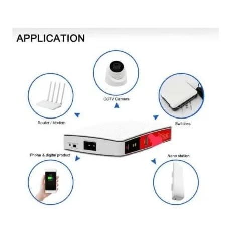 Powerbank, Mini UPS, PoE For Wifi Router And CCTV has the following features Built in Lithium Battery. Microprocessor controller guarantees high reliability. Auto start when plugged in. Manual Power off switch.Overload and Short circuit protection.