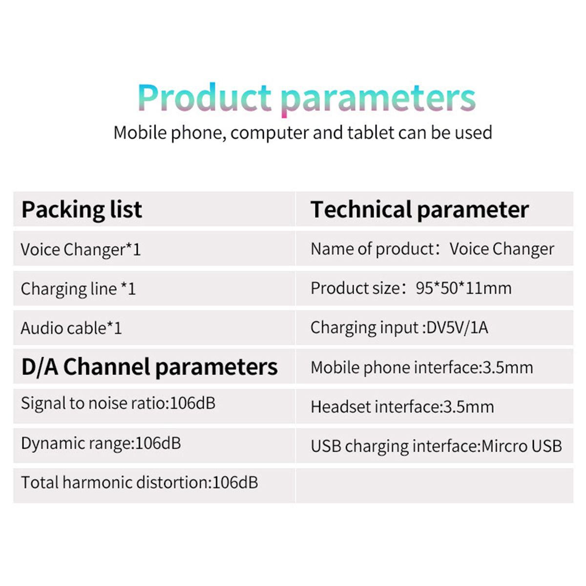 1xMini Sound Changer 1x3.5mm Audio Cable 1xMicro USB Charge Cable 1xManual