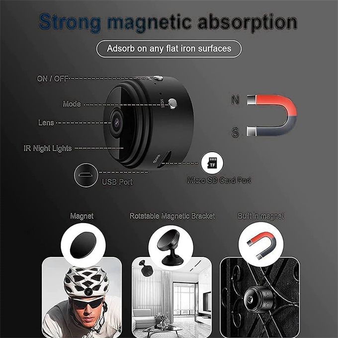 - This small camera bathroom has a built-in magnet, can work well with any iron material,easily place anywhere. This small camera with a rigid charging cable and base, when charging while recording.
