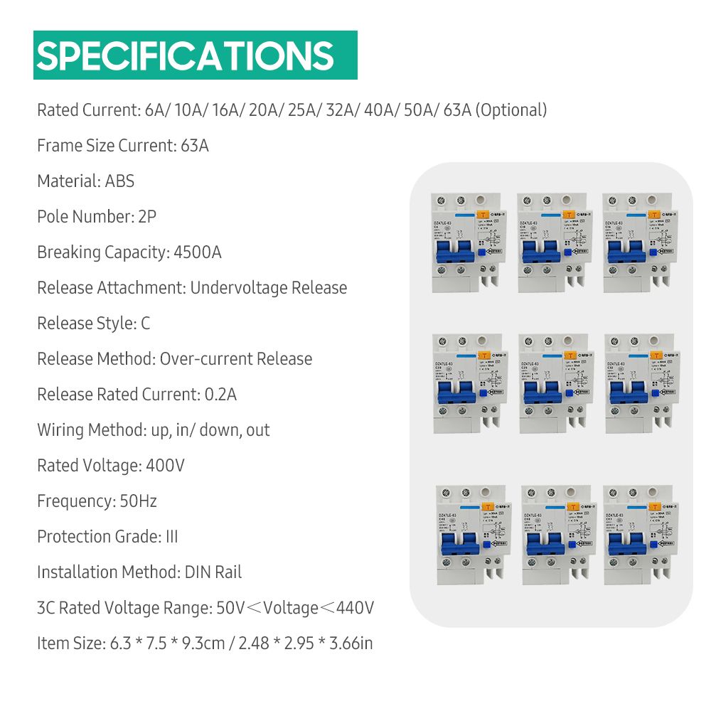 Specifications:Rated Current: 6A/ 10A/ 16A/ 20A/ 25A/ 32A/ 40A/ 50A/ 63A (Optional)
