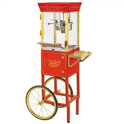 This 53 & Prime; tall vendor-style popcorn cart will be the hit of every party! It pops up to two quarts of hot, fresh kettle-cooked popcorn per batch. Providing a vintage look and feel, reminiscent of silent movie houses and carnivals circa-early 1900 & rsquo;s, the Vintage Collection & trade; Old Fashioned Movie Time Popcorn Cart is designed for home and commercial use. It features a large, stainless steel kettle with a built-in stirring system and kernel catcher to keep out the unpopped kernels. There is a compartment in the base of the unit to store supplies, making it easy to keep the cart well stocked and organized. The Vintage Collection & trade; Old Fashioned Movie Time Popcorn Cart has an easy-to-clean design and is approved for commercial use. Its accessible height makes serving a snap.