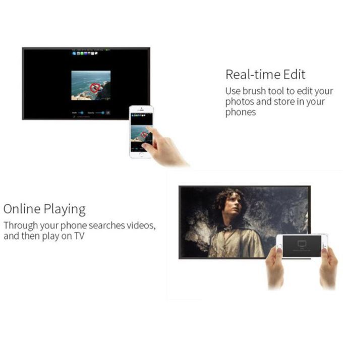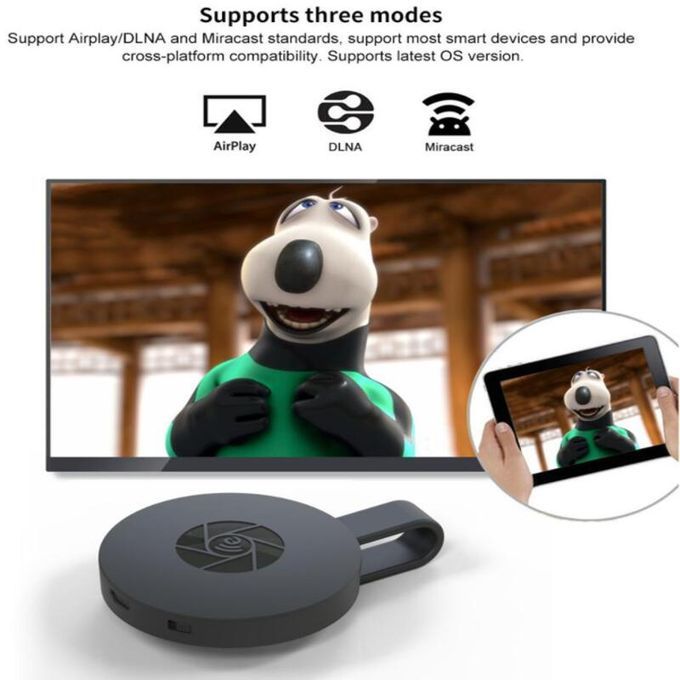 Features:1.High-definition imageSupport 1080P, you can connect PC, smartphone or iPad to TV or projector, whatever you see on your mobile device's display, you can mirror onto the HDTV or projector, create your own exclusive cinema, enjoy different audio-visual feast.2.Broad compatibilityCompatible for Android 4.2, for Mac OS X 10.9, for iOS 7.0, for Windows 8.1. Play games or share photos and videos with your family on big screen, without having to huddle around the tiny screen of a mobile device. Also, support multiple formats of photos, videos and files, out of the shackles of cable, the meeting has become intelligent and efficient.3.Small and light designRounded cute size, just like a cookie, with a magnet connected the HDMI cable on the back, which saves the space so that it is portable for you to use it anytime and anywhere.4.Easy connectionJust plug and play, no needed any other drivers, and with a switching button, you could switch Airplay mode or Miracast mode easily. Specifications:Color: blackSize: 58x90mmWiFi frequency: 2.4GHzWiFi range: 10m and lessWiFi module / version: 8188FTVResolution: 1920 x 1080 ( max )Operating system: LinuxCPU version / processor: AM8252BCPU speed: 600MHzRAM: DDR3 128MbInternal flash: SLC 128MBVideo format: AVI, DIVX, MKV, DAT, VOB, MPG, MPEG, MOV, MP4, RM, RMVB, WMVPicture format: JPEG, BMPAudio format: MP1 / 2 / 3, WMA, OGG, WAV, AAC How it works:1. Connect the HDMI connector of MiraScreen G2 to the HDTV or projector.2. Connect from your compatible device via WiFi, and you can mirror almost any content from a compatible laptop, tablet, or smartphone.3. Connect the USB plug with 5V / 2A adapter to supply the power.