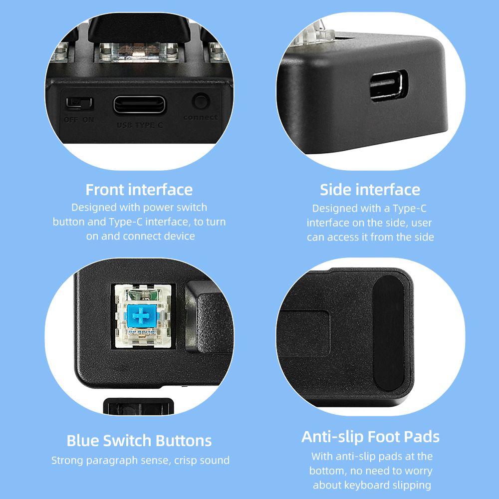 Designed with mechanical blue switches, strong paragraph sense, crisp sound. The button curve fits ergonomic design, comfortable to type.