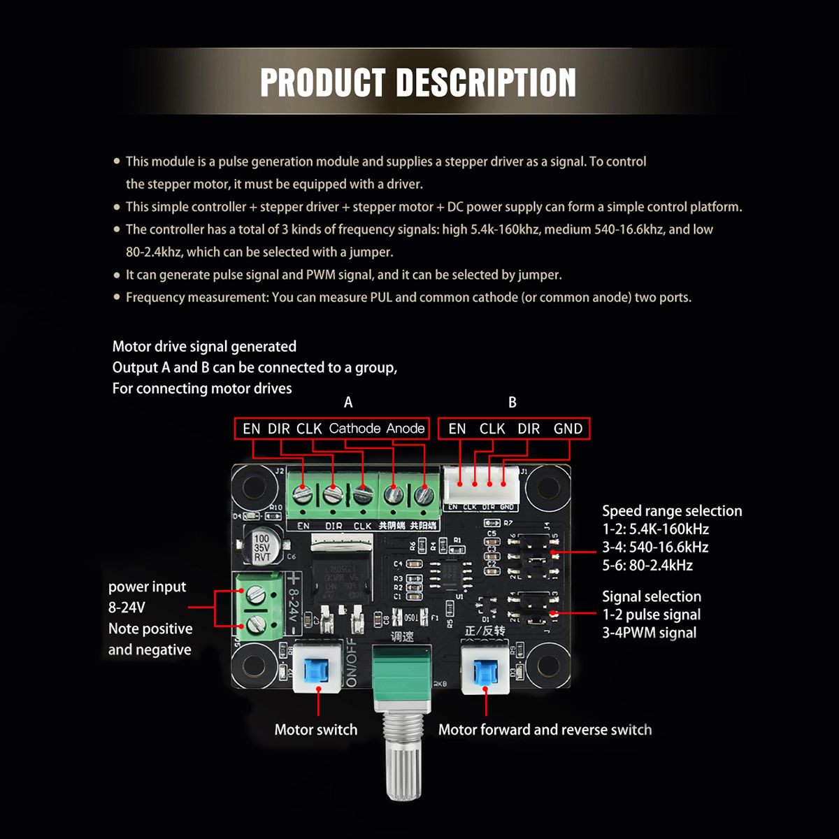 The controller has a total of 3 kinds of frequency signals: high 5.4k-160khz, medium 540-16.6khz, and low 80-2.4khz, which can be selected with a jumper.